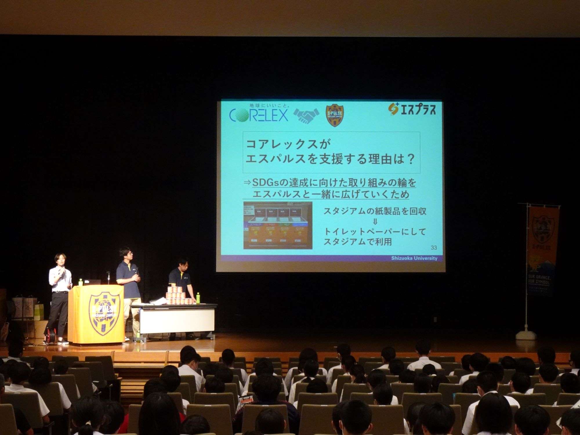 本授業は、芝川中に隣接する芝川公民館のくれいどる芝楽という立派なホールで行われました。まず、静岡本社運営部の鈴木さんから、地元企業であるコアレックスの取り組みをSDGsや環境問題の視点も含めて紹介していただきました。