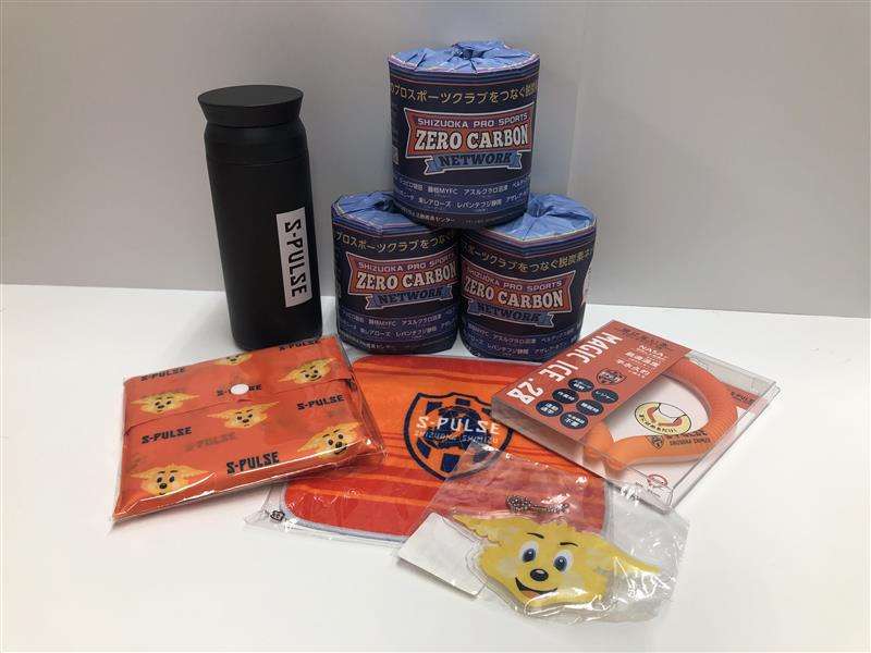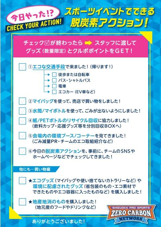 当日ブースでチェックシートにご記入いただいた方に抽選で、エスパルス選手サイン入りグッズやエコグッズ、地球温暖化防止のための県民運動アプリ「クルポ」のポイント、先着で県内プロスポーツクラブをつなぐ脱炭素ネットワークグッズをプレゼント!