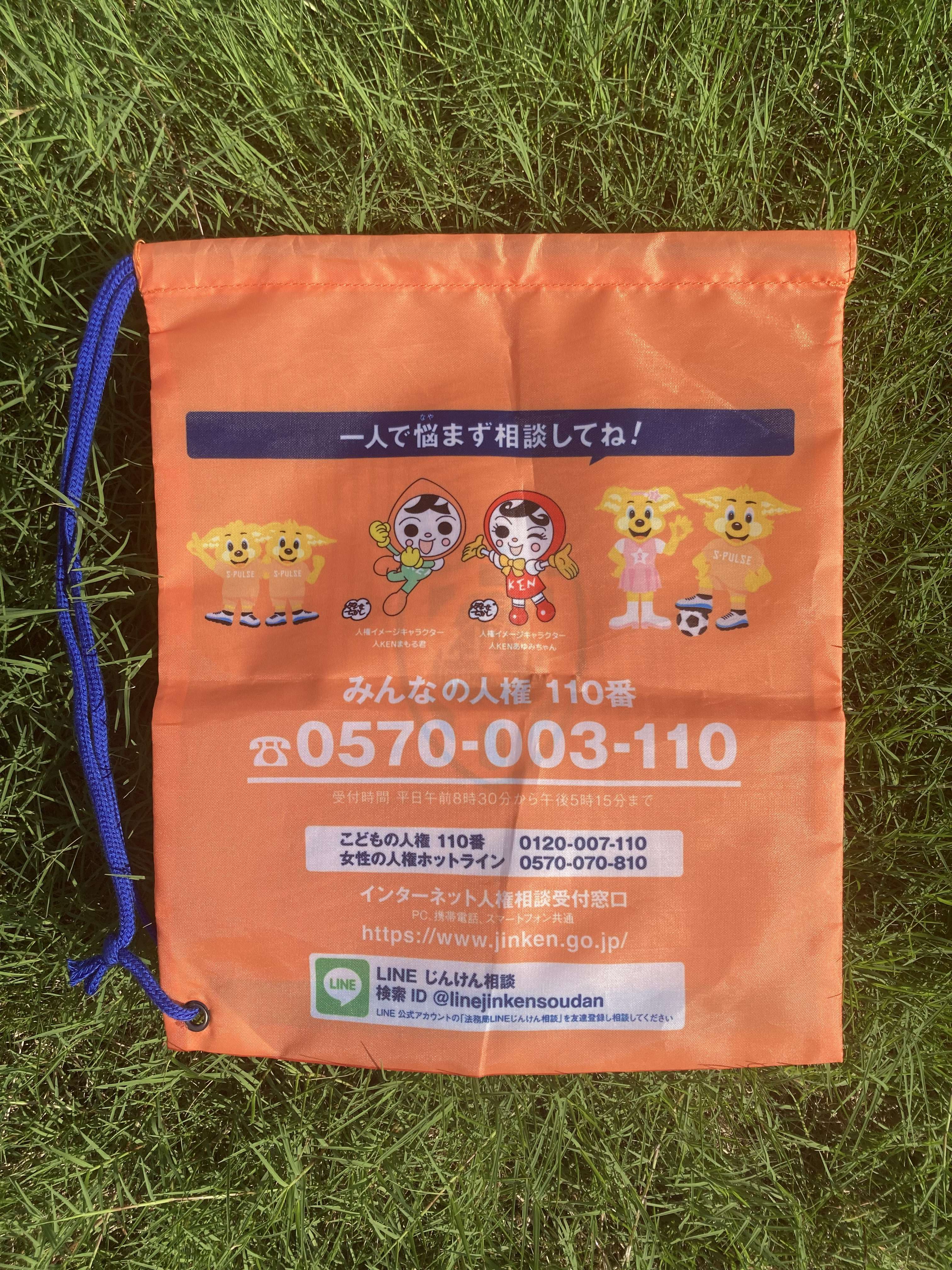 ブースでは、『人権相談ダイヤル』のPRとして、人権相談ダイヤルの案内や、LINEアカウントがプリントされた『エスパルスオリジナル巾着袋』を配布します。