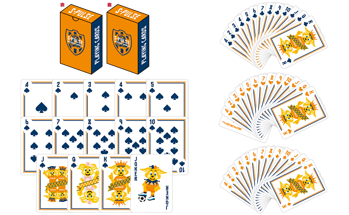 オレンジとネイビーをベースカラーにし、絵札にパルちゃんファミリーをデザインしたエスパルス仕様のトランプです。