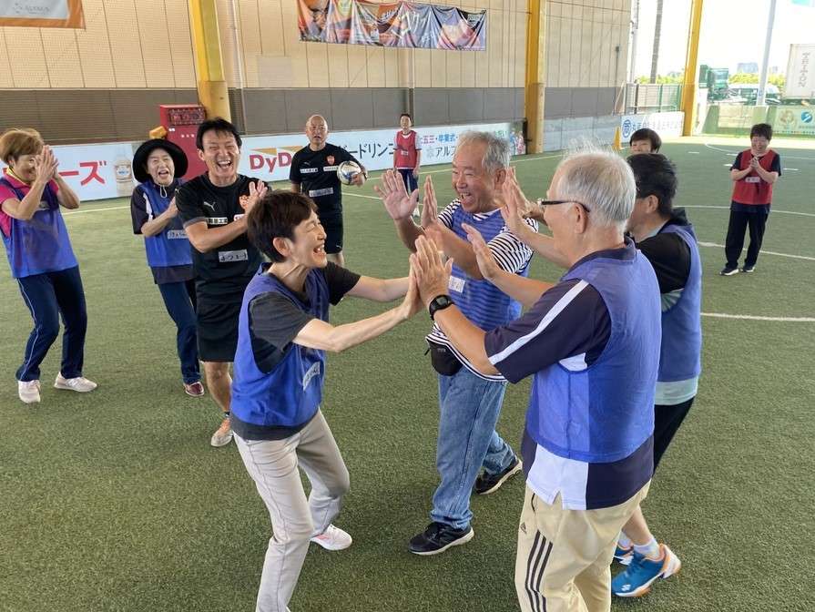 走るのも、ぶつかるのも禁止のウォーキングフットボールは、体力に自信がない方でも怪我無く安心です。今回初めてチャレンジした皆さんも、普段サッカーをプレーすることが全くない皆さんでも、楽しく安全にプレーすることができました。ゴールが決まった瞬間には、チームメイトと喜びを共有しあい、身体や脳の活性化だけでなく、コミュニティの場としても非常に楽しい時間を過ごしていただけます。