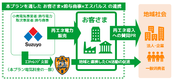 また、本プランの電気料金の一部(電力使用量1kWh あたり0.25 円)を、地域と連携したカーボンニュートラル活動(エスパルス エコチャレンジ)への支援金として、鈴与商事からエスパルスに還元いただきます。