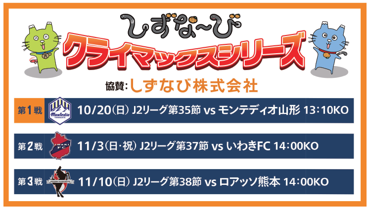 清水エスパルスのクラブパートナーである「静岡セキスイハイム不動産株式会社」様が、10月1日から社名変更し、「しずなび株式会社」となりました。このたび、2024シーズンもご協賛いただき、シーズン終盤のJ1昇格・J2優勝に向けた大事な大事な3試合を対象として、クライマックスシリーズの実施をお知らせいたします。