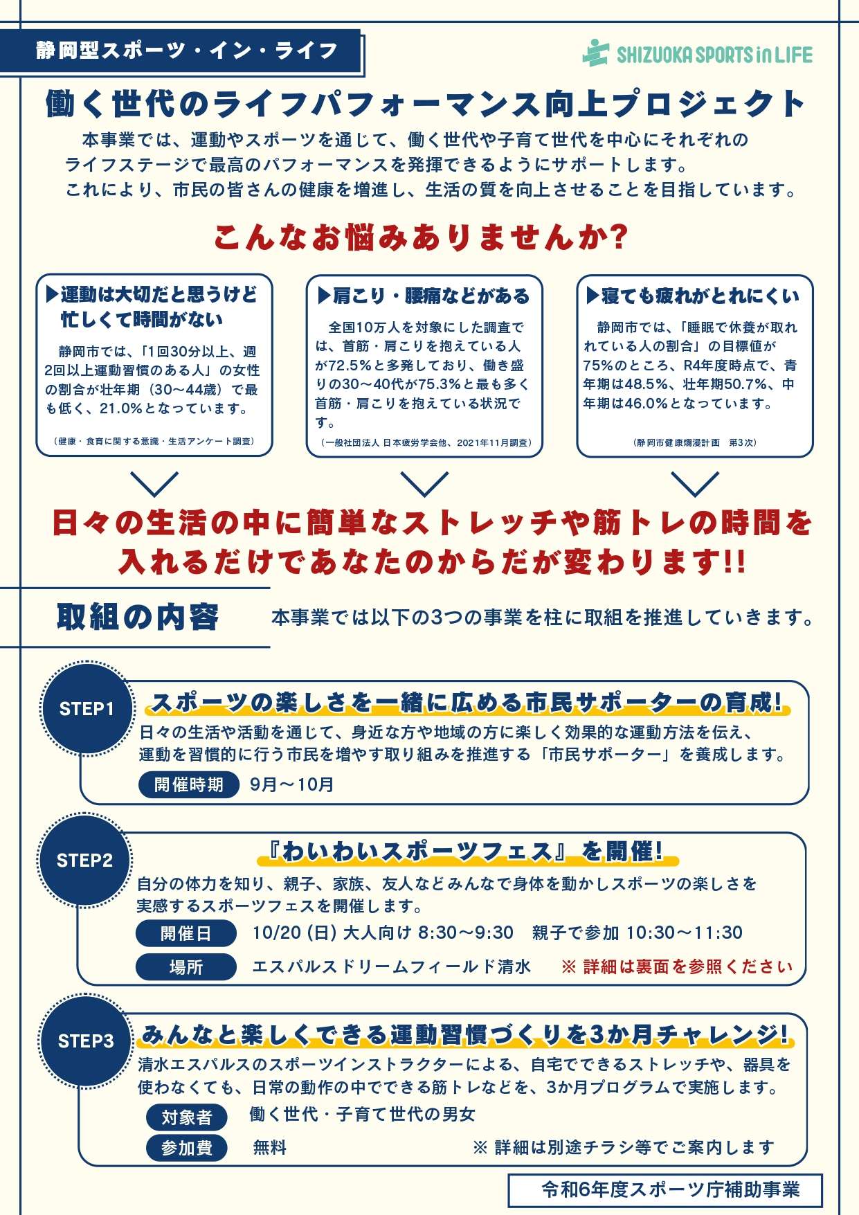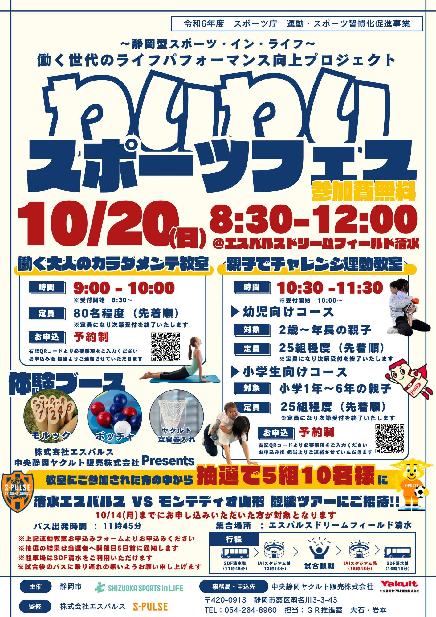 エスパルス監修のもと、静岡市及び中央静岡ヤクルト販売株式会社と共に、静岡型スポーツ・イン・ライフ~働く世代のライフパフォーマンス向上プロジェクト~「わいわいスポーツフェス」を開催しますのでお知らせいたします。