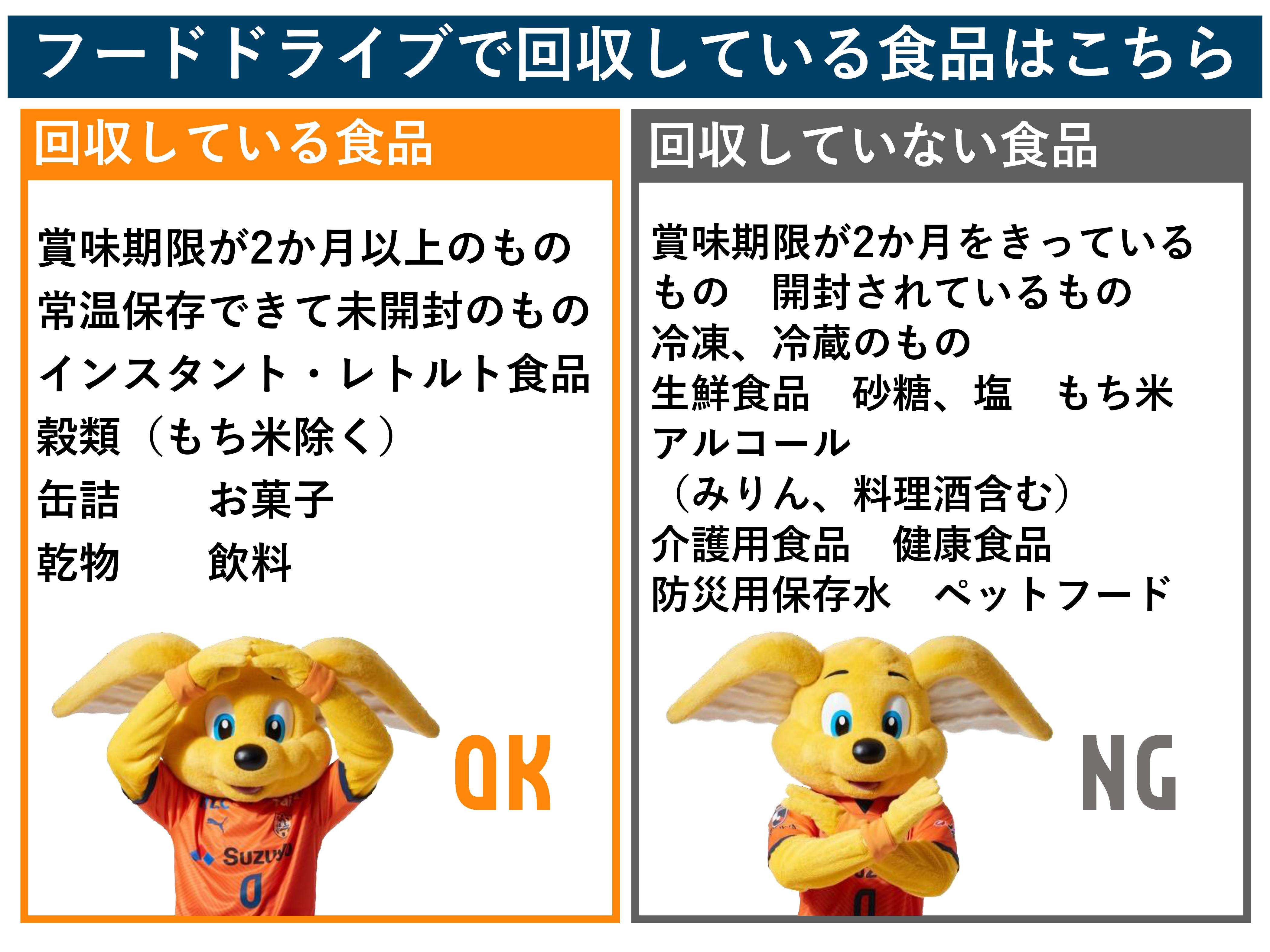 「フードドライブ」とは、ご家庭で発生する食品ロスを減らす方法の1つで、家庭で眠っている食品を集めてフードバンクに寄付する活動です。ぜひ食品を回収場所にお持ちいただき、エスパルスファミリーから必要な人に届けましょう!