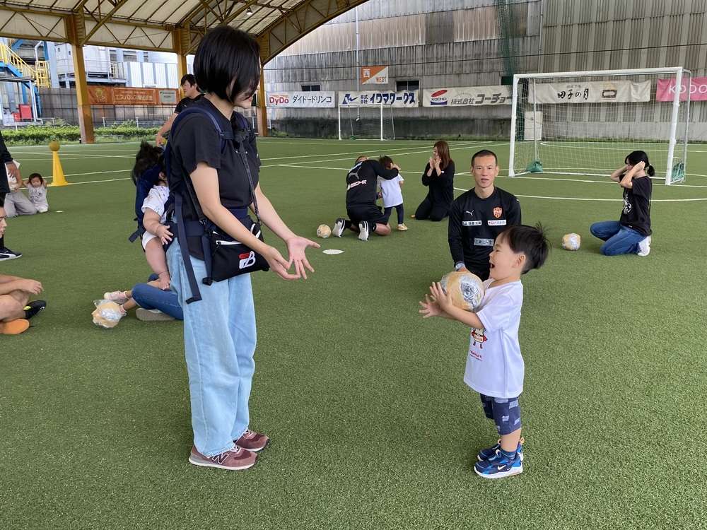 作ったボールを「なげる」・「とる」といった動作を必要とするキャッチボールや、ボールを「ける」・「わたす」動作が主となるシュート練習などを行います。最後はボールを使ったサッカー対決を親子で実施し、ゲーム形式の中で楽しく運動する機会を創出します。