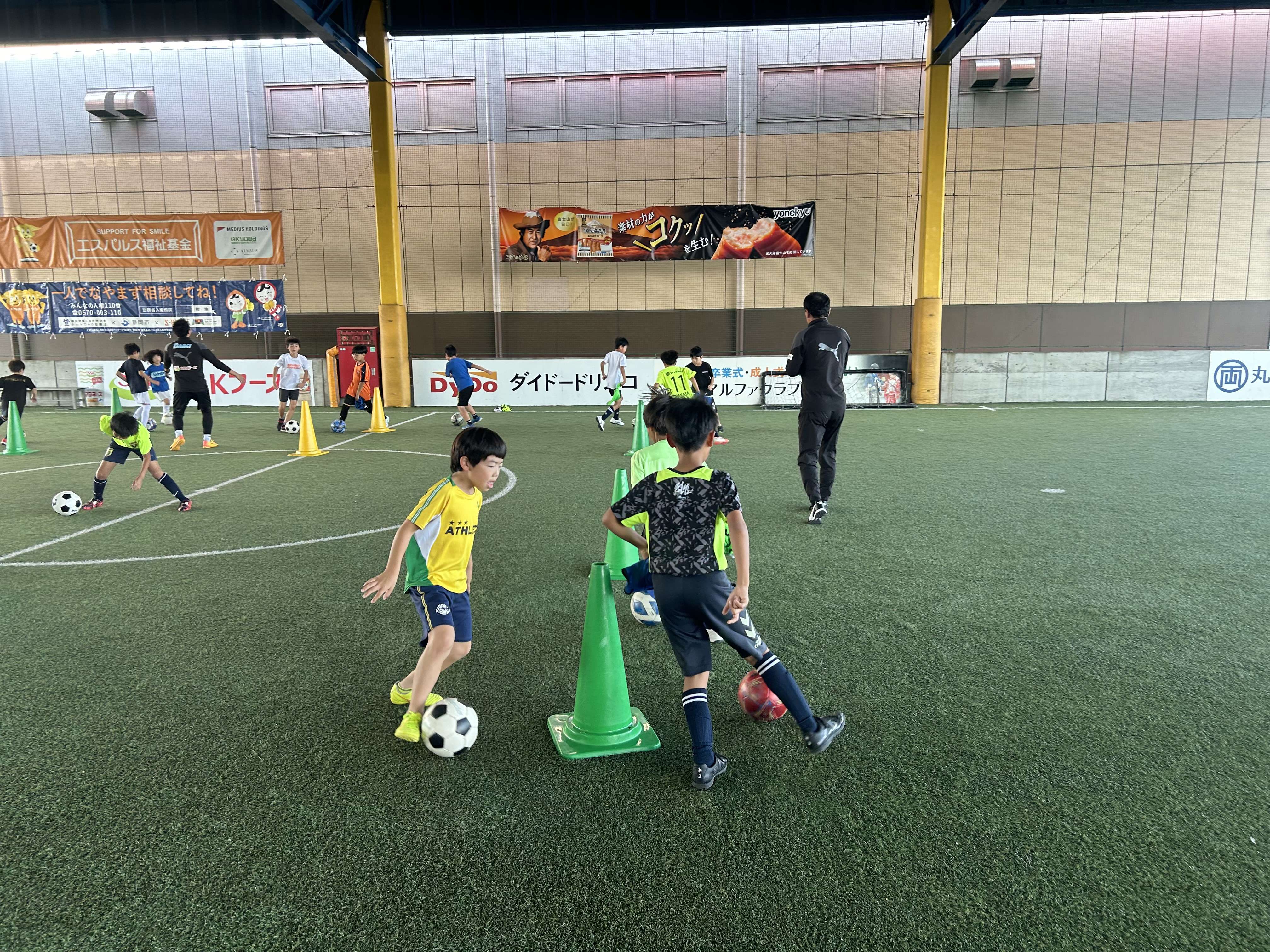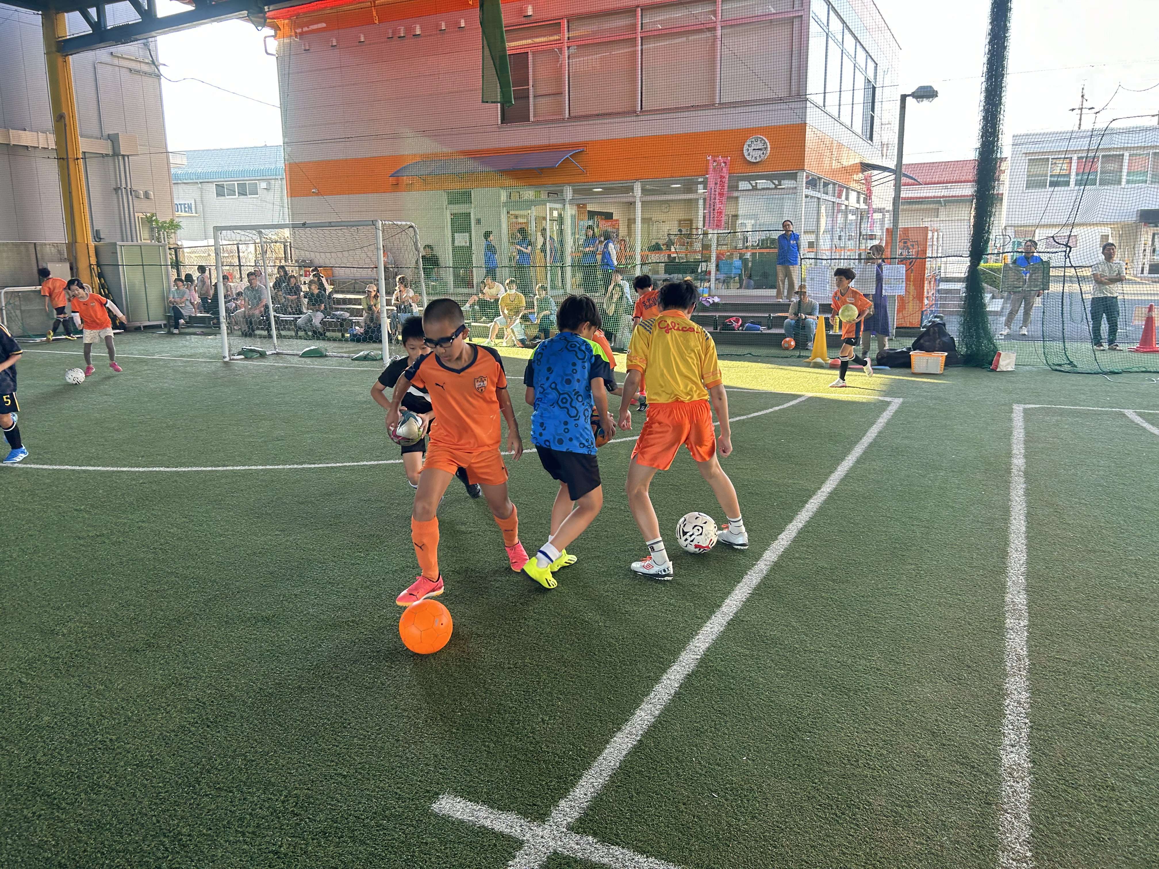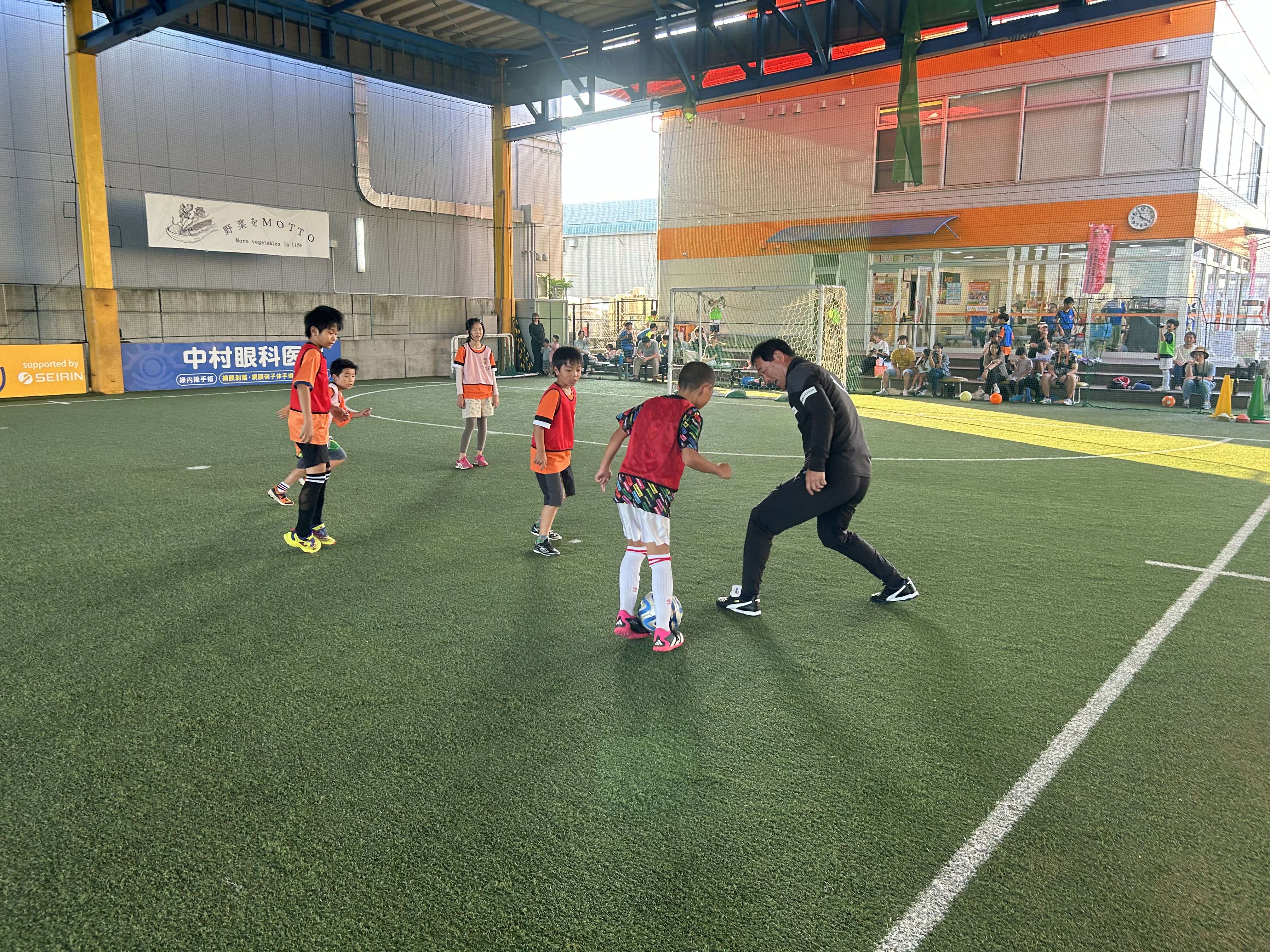子どもたちは、アドバイスを真剣に聞き、パス練習やドリブル練習、1vs1、ゲーム形式など思いきりプレーし、相手の気持ちを考えることや思いやることの大切さをサッカーの中で楽しみながら学んでいく様子が印象的でした。ゲーム形式のメニューには平岡アカデミーヘッドオブコーチングも参加し、トラップやパス等、1つ1つのプレーの質の高さに子どもたちは驚いている様子でした。