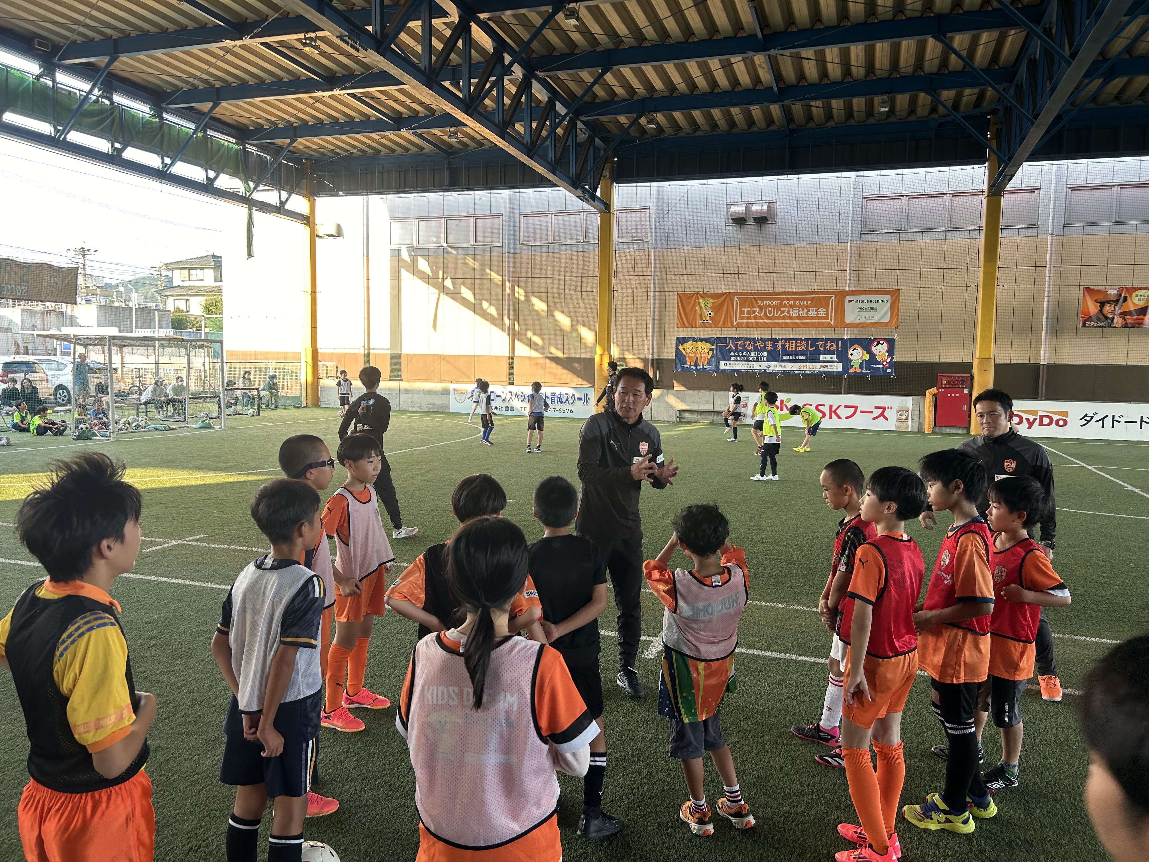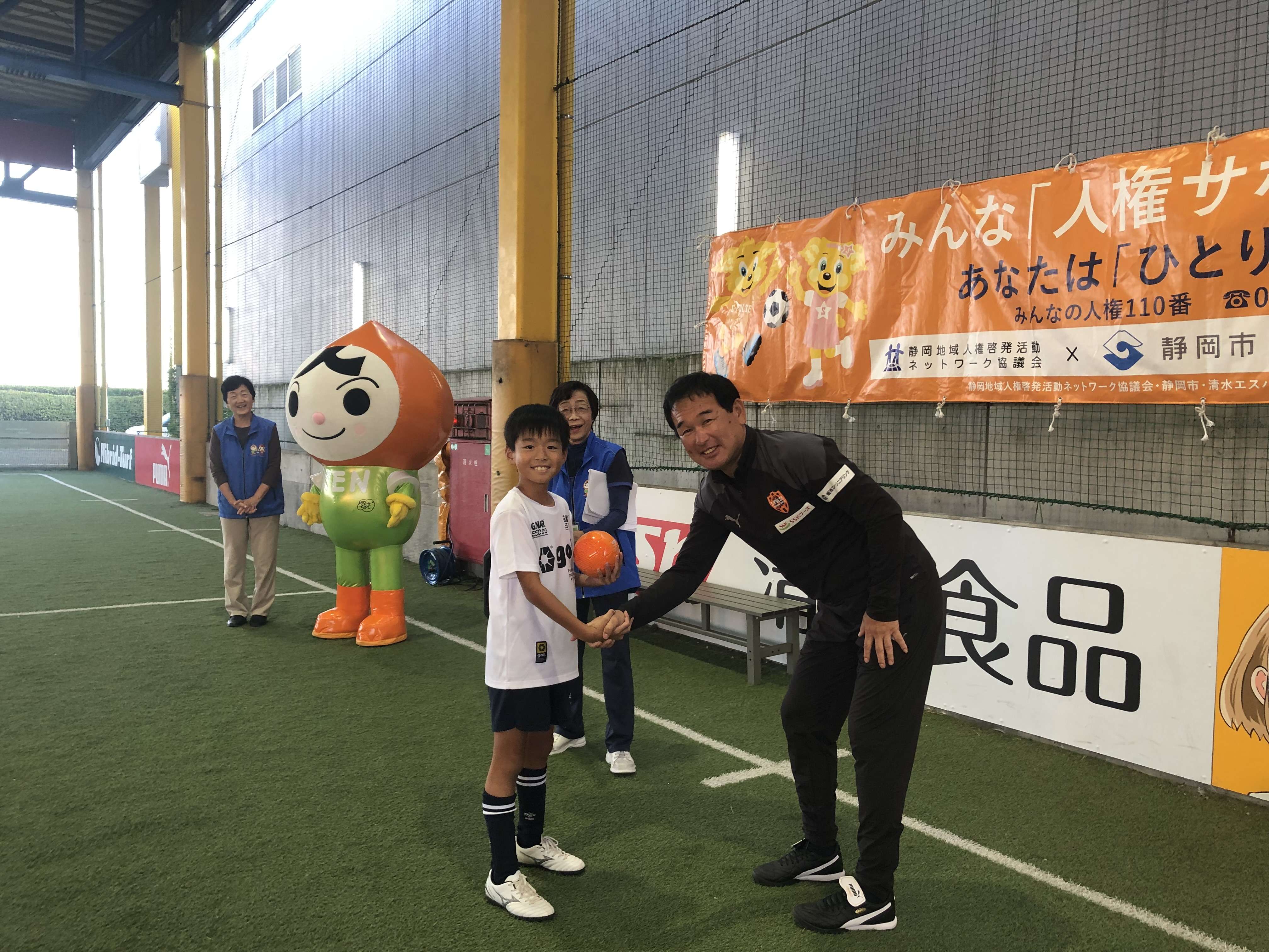 エスパルスが静岡市、静岡地域人権啓発活動ネットワーク協議会と連携し、人権尊重思想の普及高揚を図るための取り組みとして開催する『人権サッカー教室』が10月13日(日)、エスパルスドリームフィールド清水で行われ、平岡アカデミーヘッドオブコーチング、エスパルスサッカースクール・松尾大介コーチ、森田祐史コーチ、土田陸斗コーチ、藤巻智宏コーチが講師として参加しました。