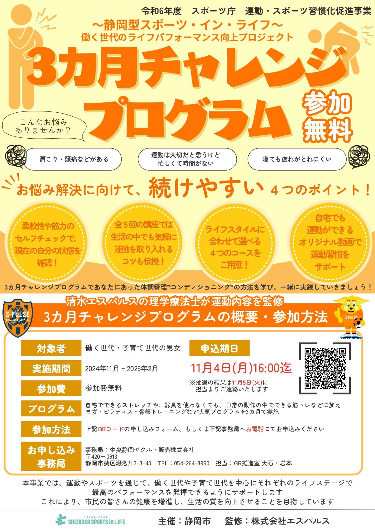 エスパルス監修のもと、静岡市及び中央静岡ヤクルト販売株式会社と共に、静岡型スポーツ・イン・ライフ~働く世代のライフパフォーマンス向上プロジェクト~「3ヶ月チャレンジプログラム」を開催しますのでお知らせいたします。