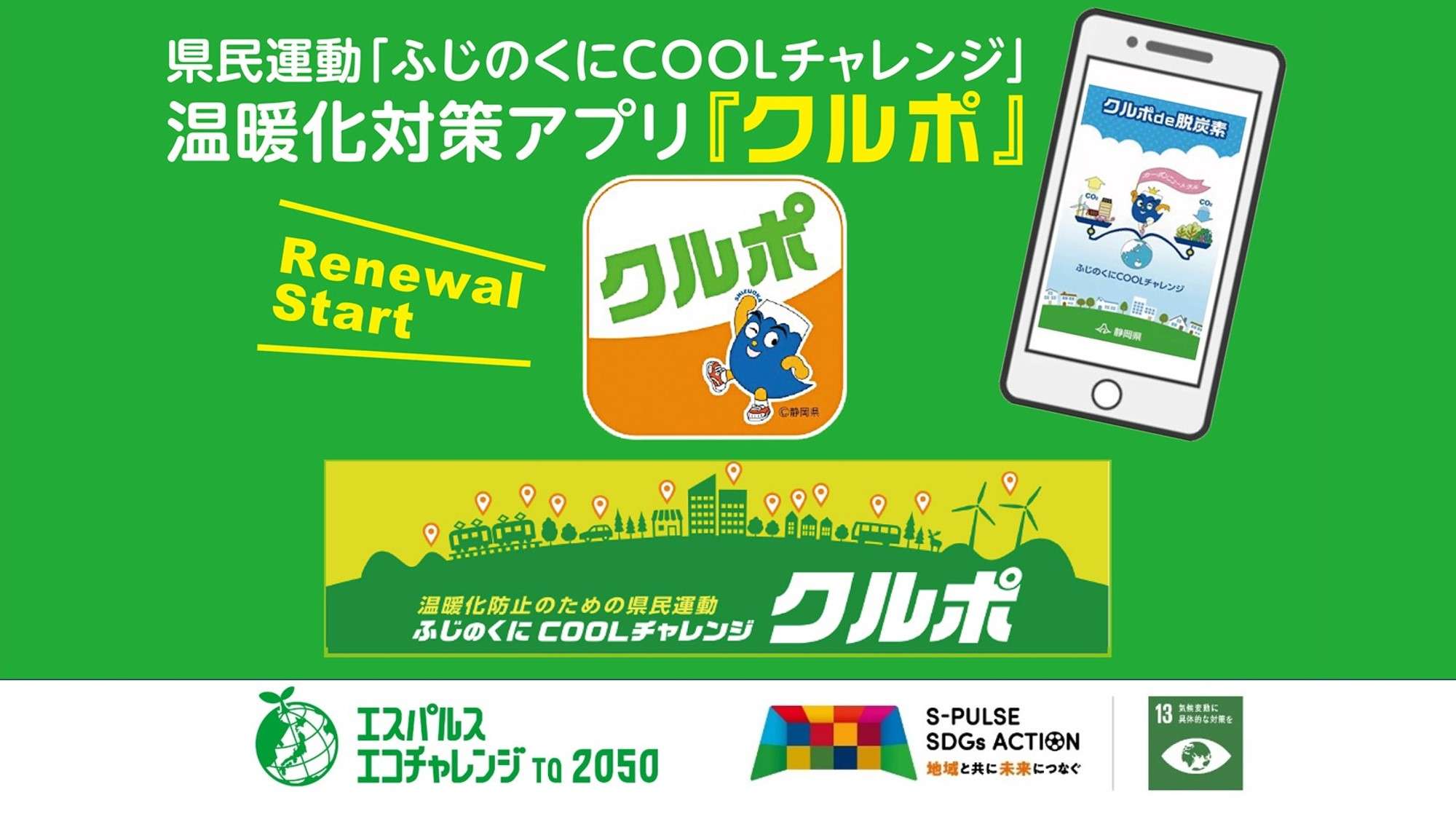静岡県が実施する温暖化対策アプリ・クルポで『エスパルスエコチャレンジ』を応援しよう!ぜひクルポアプリをダウンロードいただき、アイスタにご来場ください。