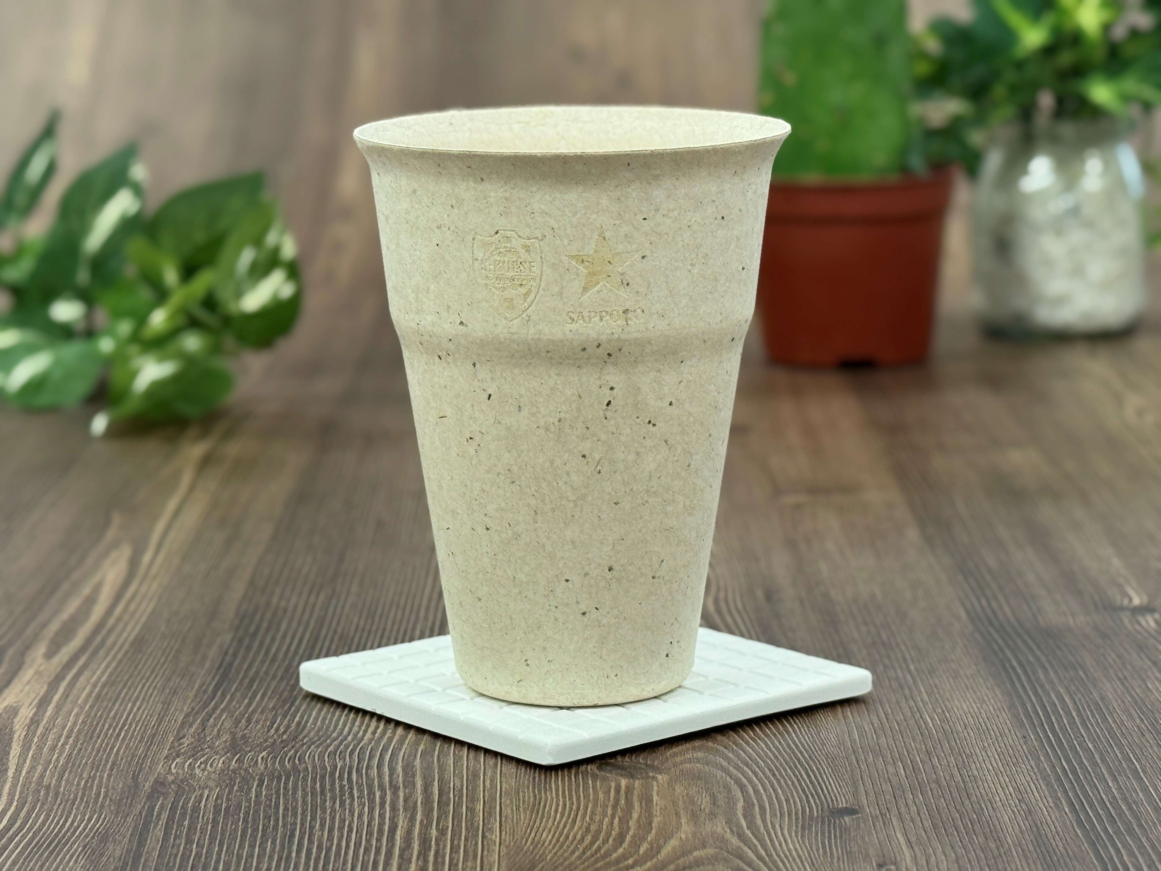 「もるたん」は通常の紙コップとは異なり、ビール類の製造過程で生成する副産物のモルトフィード(麦芽の殻皮)を原料の一部にとりいれアップサイクルした製品となります。パルプモールド製のタンブラーで、パルプモールドとは木質繊維(パルプ)を主原料として、水に溶かした木質繊維(パルプ)を乾燥させてできる紙製の成形品です。プラスチック包材の代替品として使用するなど、環境に配慮した包材として注目を集めています。