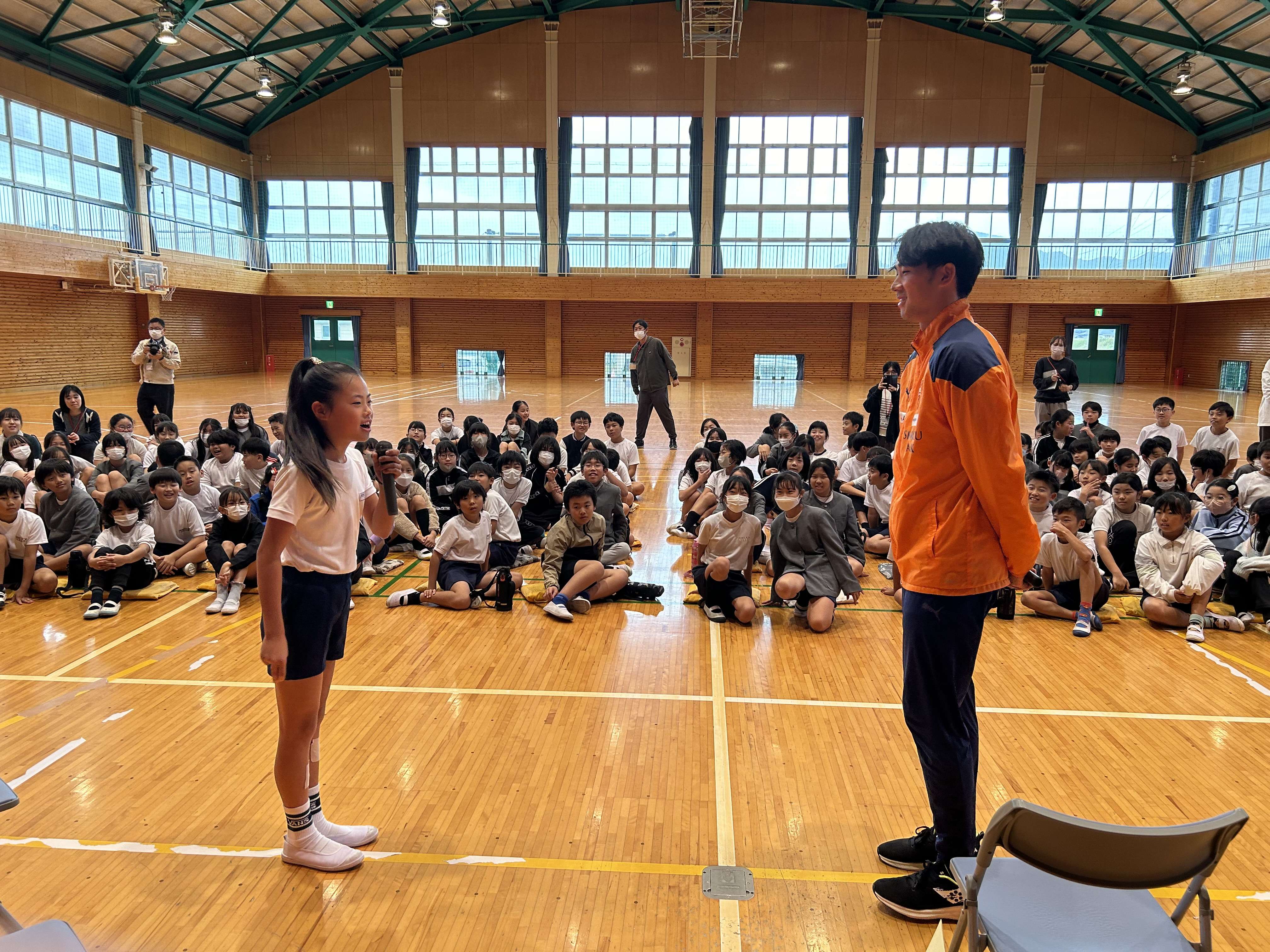 児童達からの質問コーナーでは、「梅田選手のように身長が高くなるには、どうしたら良いですか?」「身体が大きくなるために何を食べていましたか?」などといった質問にも1つ1つ丁寧に答えました。「僕はキーパーをしていますが、プレー中に心掛けていることは何ですか?」という質問に対して、梅田選手は「キーパーはミスが失点につながるポジション。1つ1つのプレーに集中することと、ミスを限りなくなくすように練習に取り組むことをしていました。」とキーパーという特殊なポジションにおける心構えを話してくれました。