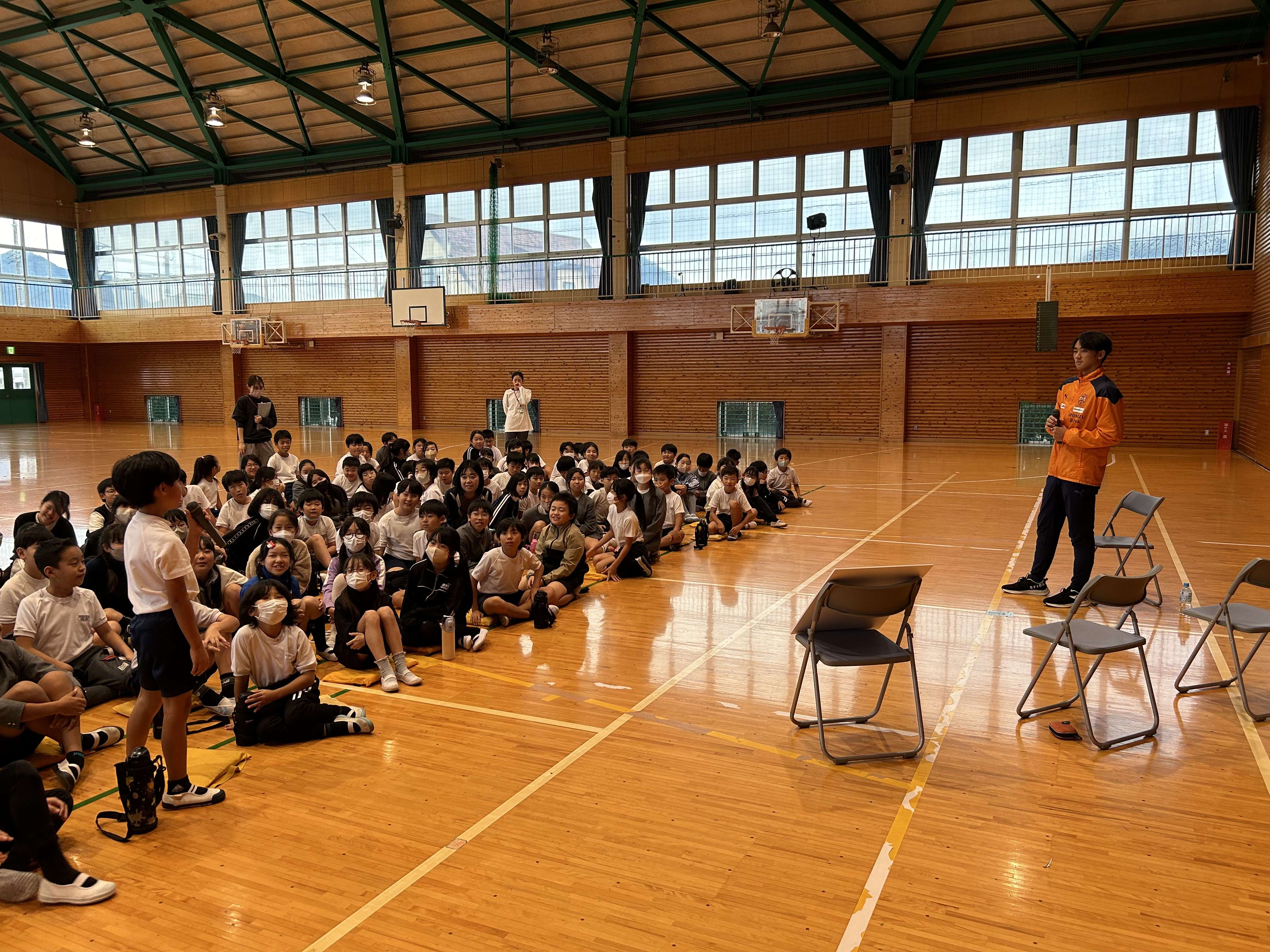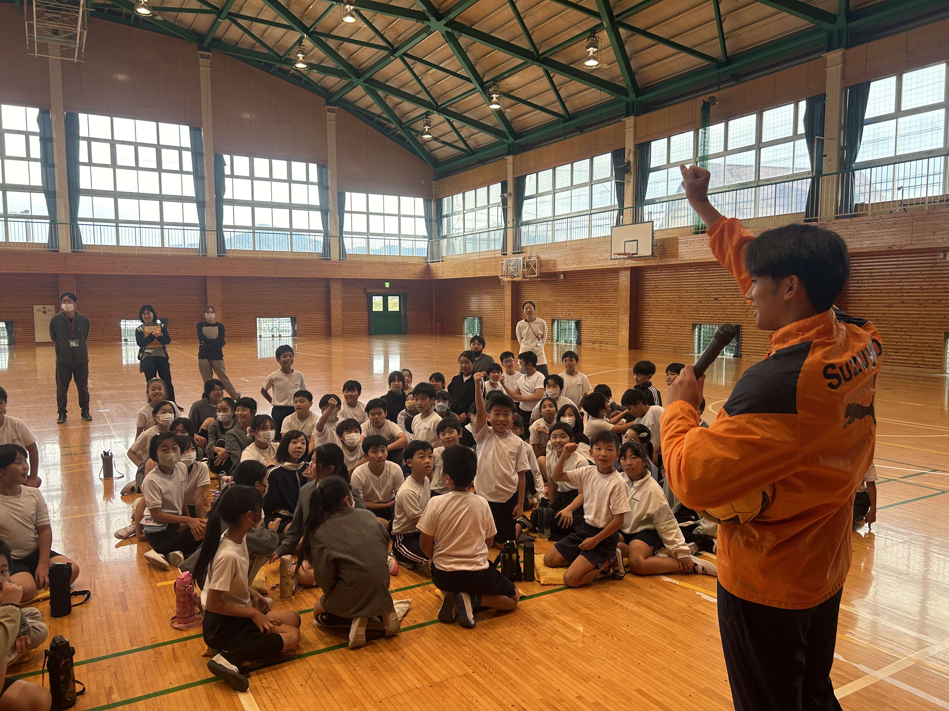 はじめに、ゴールキーパーの梅田選手は児童たちの前でボールを使ってスローイングをしました。梅田選手とのじゃんけんを勝ち抜いた代表の児童が体育館の対角に立ち、梅田選手はスローイングをして強肩を披露しました。体育館の端から端まで飛ぶボールを見て、その飛距離と正確性に児童たちは驚きの声を上げていました。