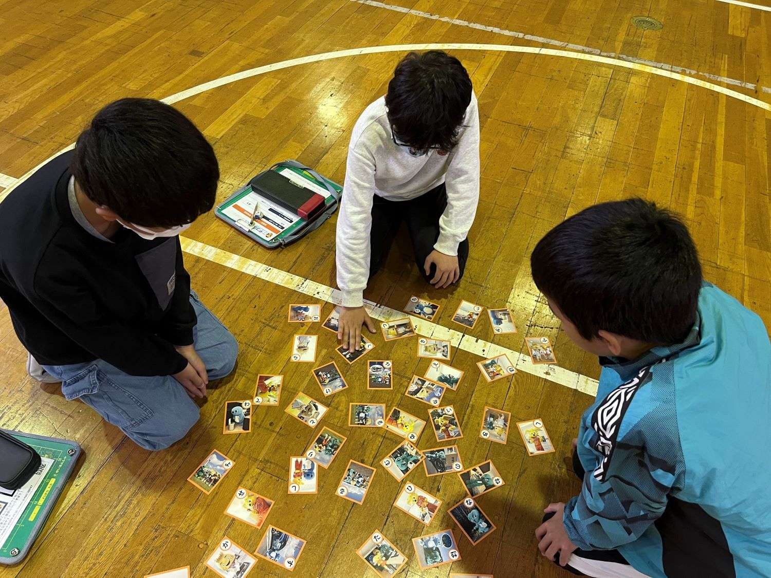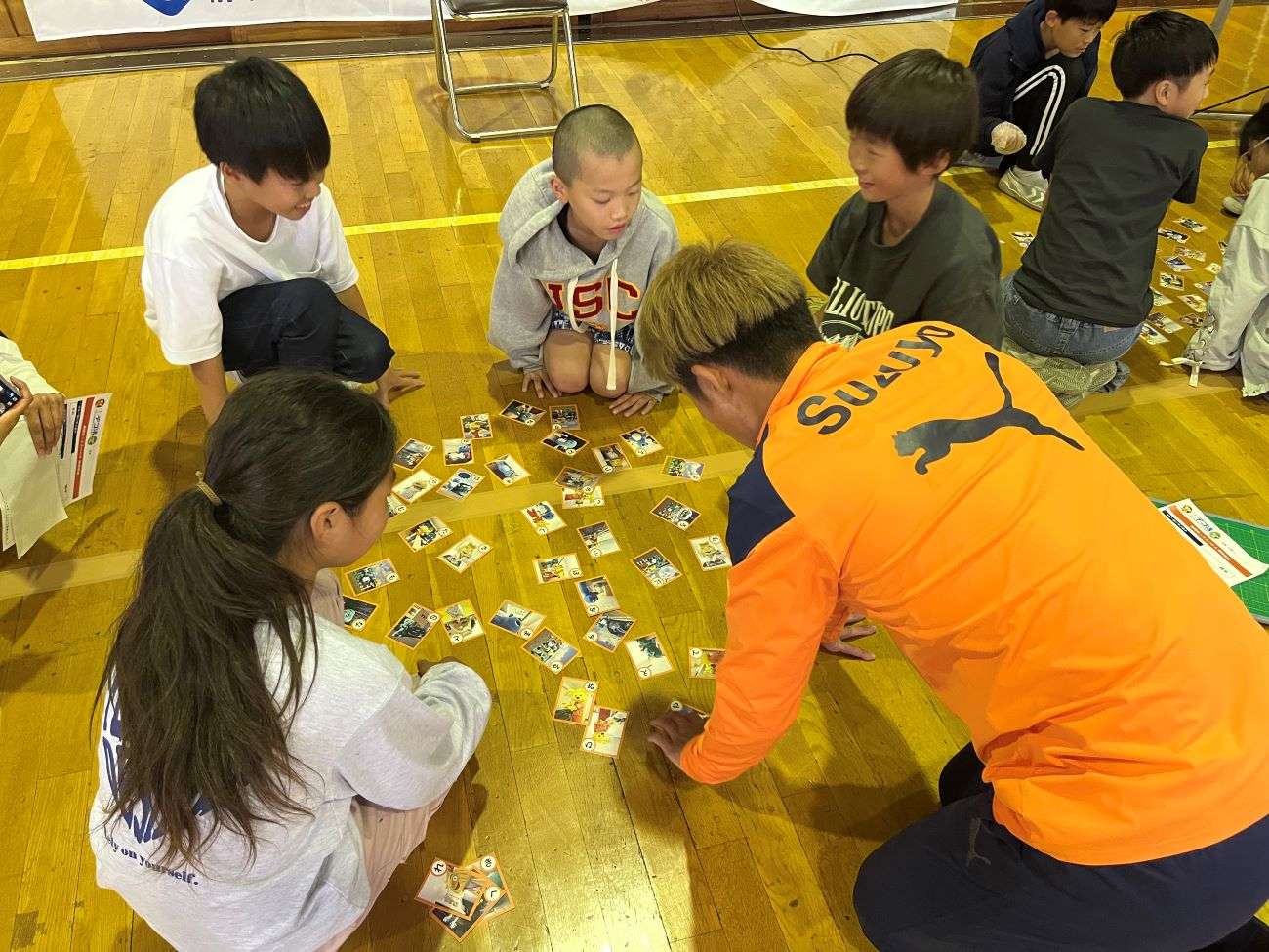 環境教室の後半では、4~5人のグループに分かれてCOOL CHOICEかるた体験を行いました。「COOL CHOICE」とは、地球温暖化対策に資するあらゆる「賢い選択」を促す国民運動です。かるたには、デコ活やCOOL CHOICEに関するイラストと頭文字が書かれています。宇野選手も色々なグループに入りながら一緒に札をとり合うと、普段とは違う選手の姿に児童たちは大喜び。宇野選手はなかなか札が取れず、悔しがっている様子も見受けられました。