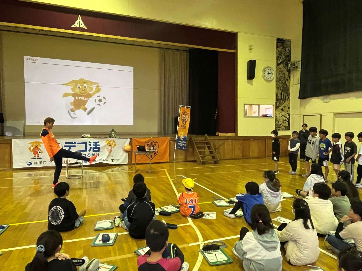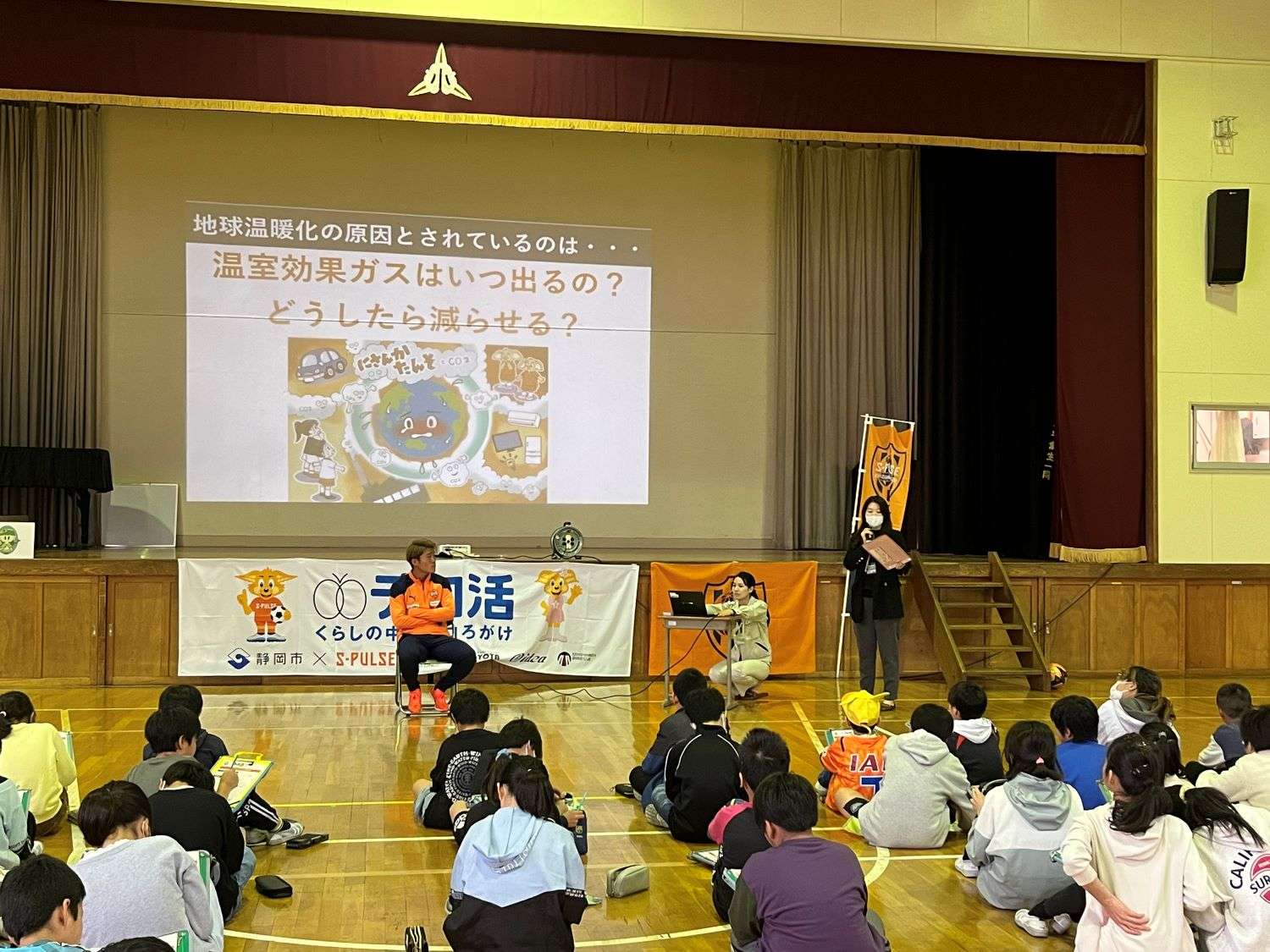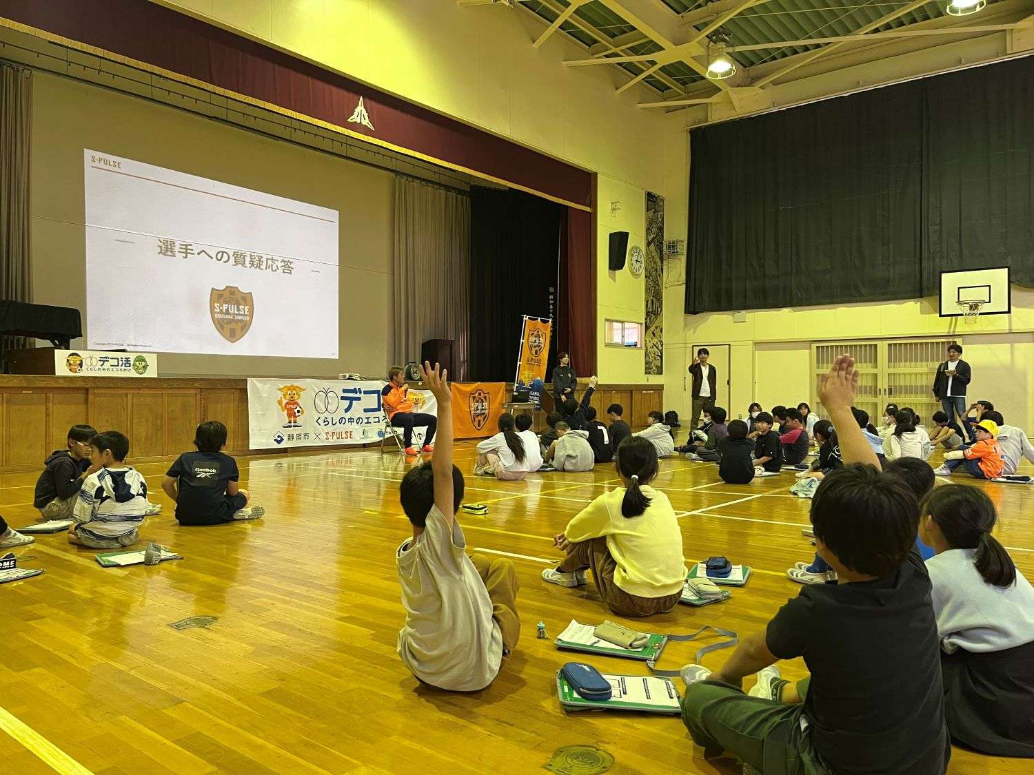 11/14(木)静岡市立井宮北小学校で行われた『デコ活 環境教室』に宇野禅斗選手が参加し、静岡市と清水エスパルスが過去に協働で作成した「COOL CHICEかるた」を使いながら、地球温暖化や環境問題について楽しく児童と共に学びました。