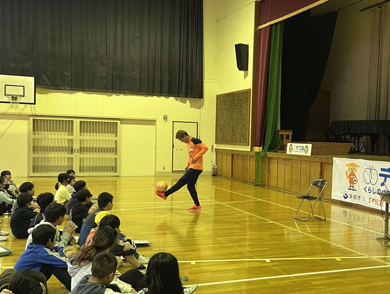 最初にエスパルスが取り組む環境事業や授業主旨について簡単な説明をした後、宇野選手が登場し、リフティングを披露したり、子どもたちとパス交換を行ったりして、場を和ませました。