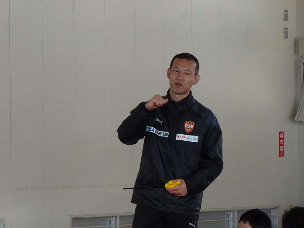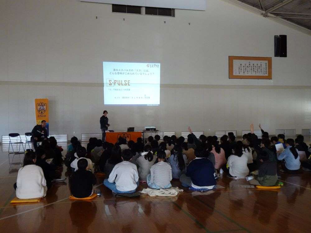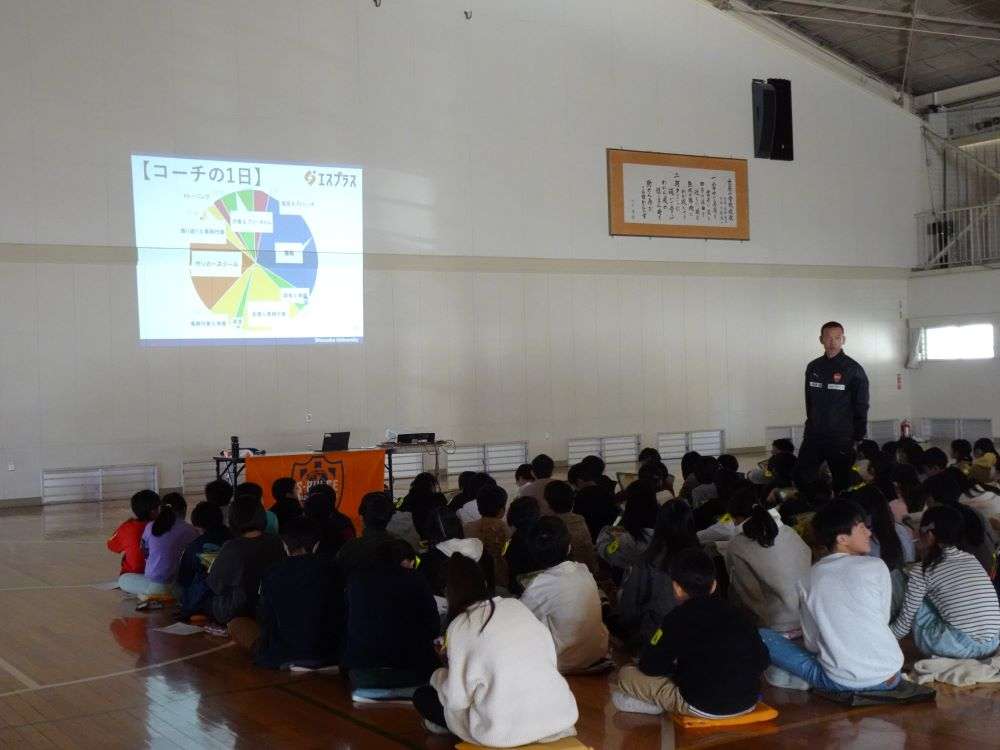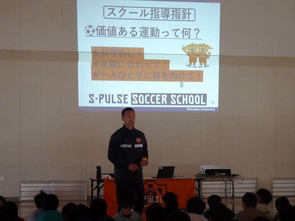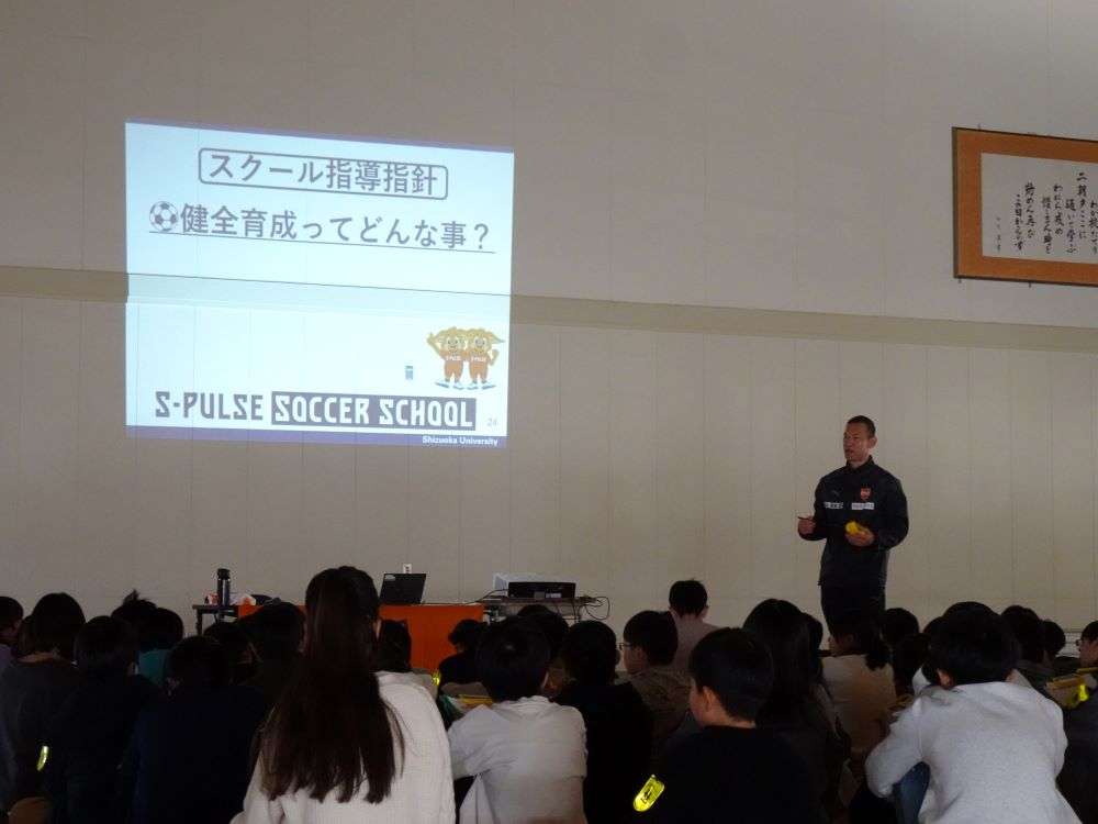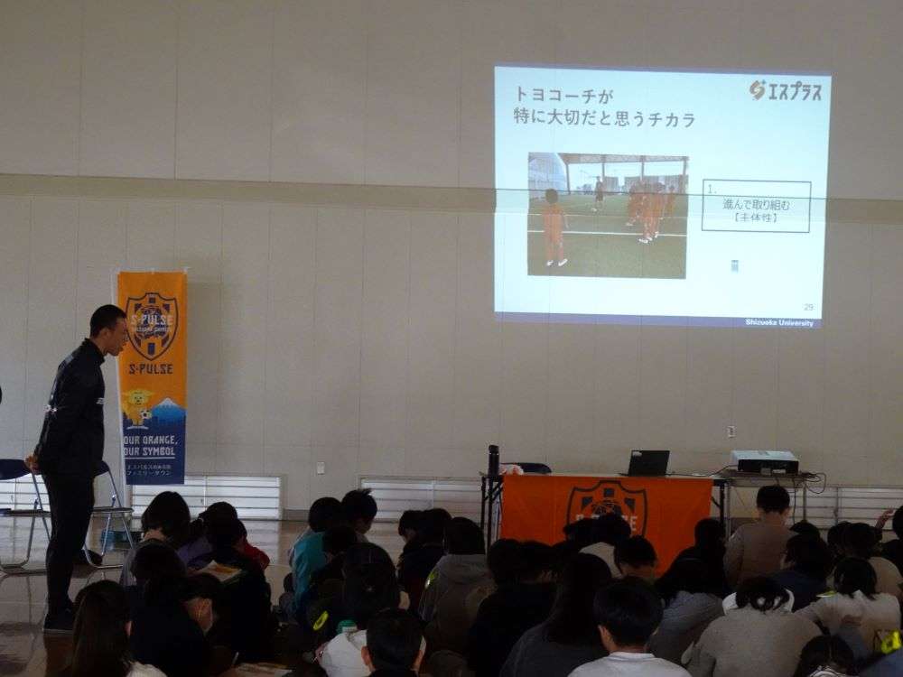 授業では、まずエスパルスの概要を説明し、エスパルスと富士市のつながりについても紹介しました。次に、萩原コーチから、「エスパルスを支えるスタッフ(スクールコーチ)の仕事」についてお話しがありました。