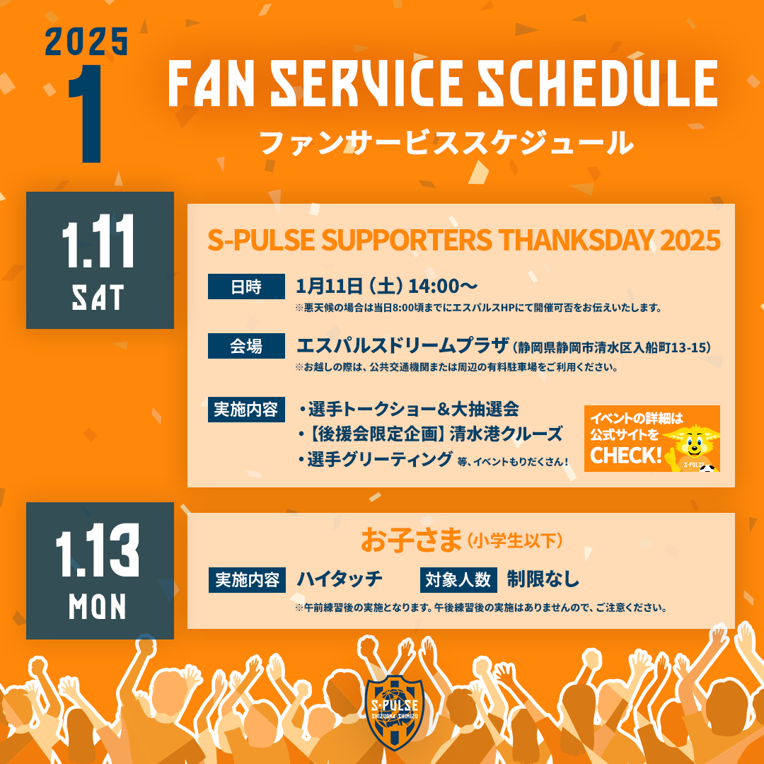 ファンサービスは、練習後に「実施対象」「実施内容」を設けた上で、指定日のみでの実施とさせていただきます。ファンサービスの「実施日」「実施対象」「実施内容」は事前にエスパルス公式ホームページにてお知らせをいたします。