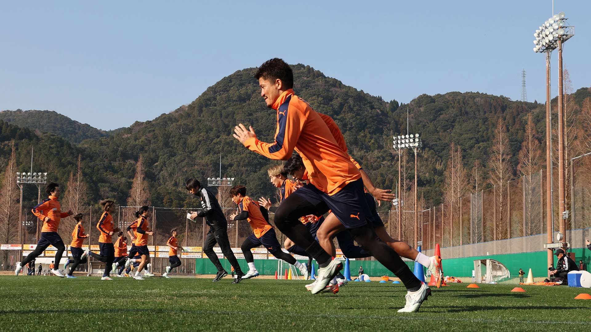 小雨が降った前日から一転して、少し汗ばむほどの快晴に恵まれたキャンプ3日目。早朝、チームスタッフが準備した午前練習用の用具はカラーコーンやマーカーのみで、GKのトレーニングエリア以外にはボールが一つも出ていなかった。秋葉忠宏監督が「鹿児島ではもっときつい練習で追い込んでいく」と宣言していたとおり、厳しいフィジカルメニューが待ち受けていた。