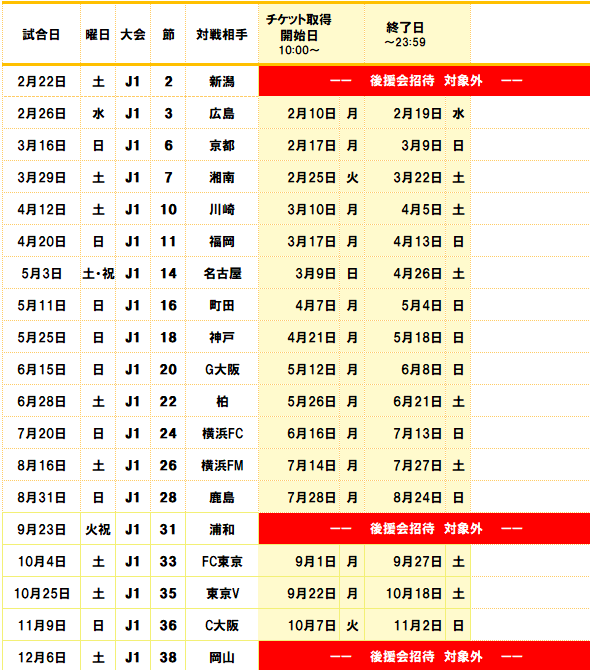 2月26日(水)広島戦~11月8日(土)or11月9日(日)C大阪戦