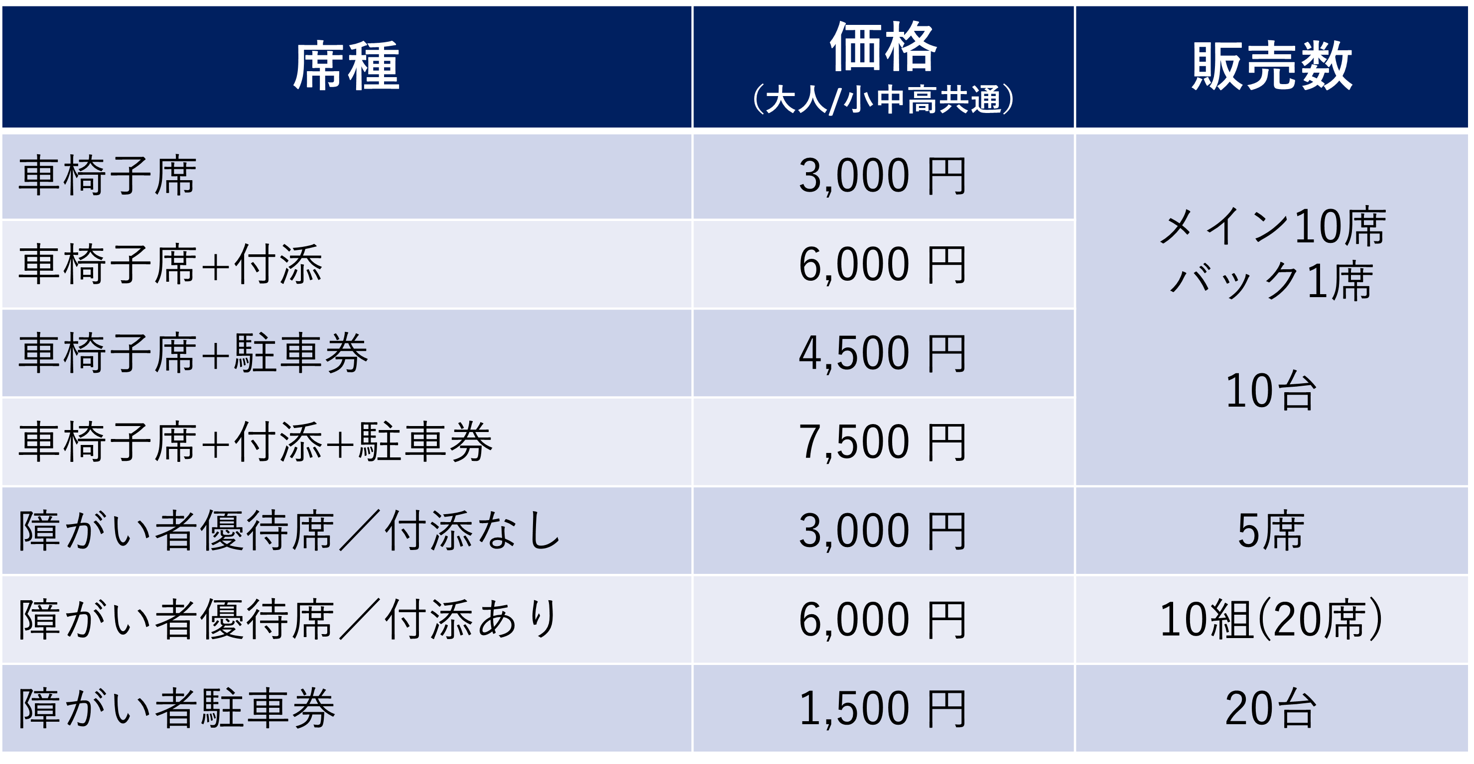 車椅子席(付添)および、車椅子席専用駐車券は車椅子席とセットでのみ、購入いただけます。