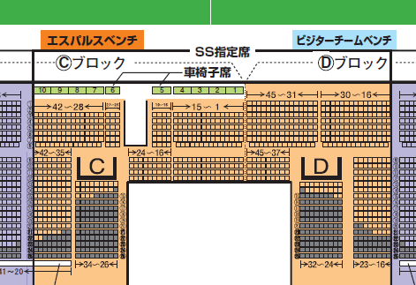 メインスタンドは車椅子席の入口通路を中央とし、西側/東側に1席ずつ自動で配席されます。購入時に「西側/東側」を選択してください。