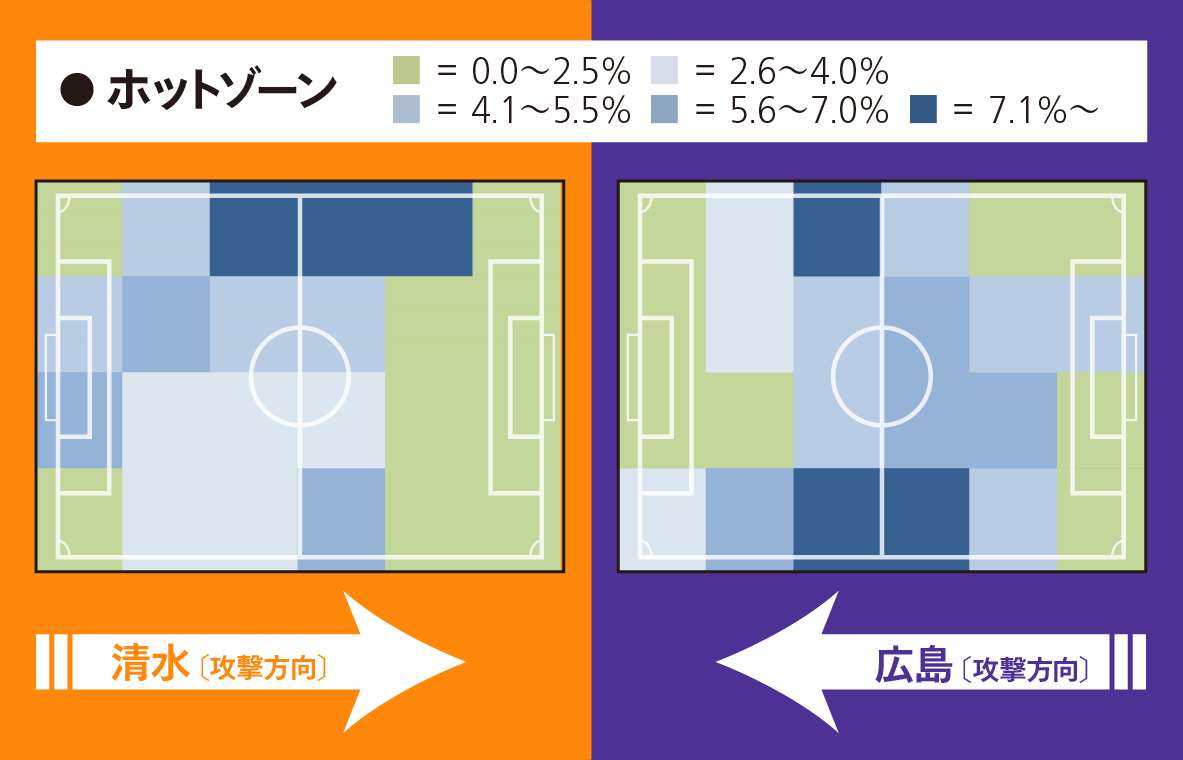 広島のスタイルは昨季とほぼ変わっていない。昨季の広島は、クロス、シュート、ゴールの3項目がリーグ1位。得失点差は+29で優勝した神戸を上回る1位。1試合平均得点は1.89とJ1で最高の攻撃力を見せたが、失点も6番目に少なかった(1試合平均1.13失点)。広島の得点パターンとしては……