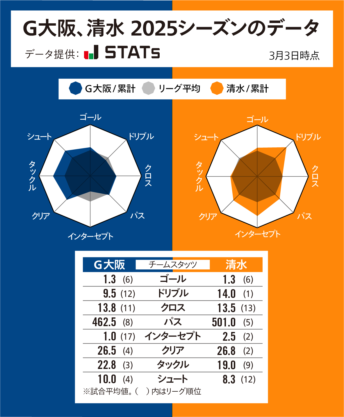 早くも今季3回目となるオリジナル10対決。ダニエル ポヤトス監督が就任3年目を迎えたガンバ大阪は、1年目の16位から昨季は4位に上がり、天皇杯では準優勝と躍進。失点がJ1で2番目に少なく安定した戦いを見せた。今季は2勝2敗の10位と好スタートとは言えないが、前節では離脱者が多い中で東京Vを1-0で下し、底力を見せた。G大阪のレーダーチャートを見ると……