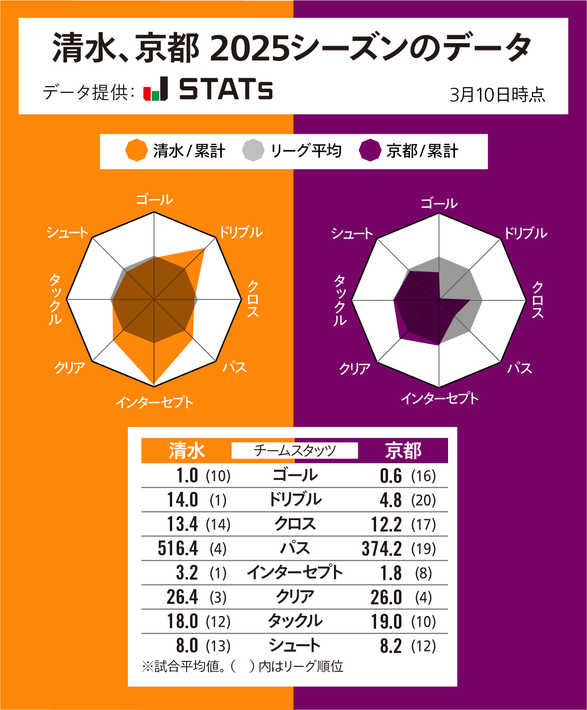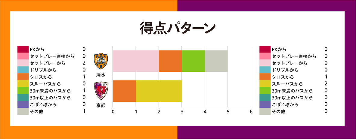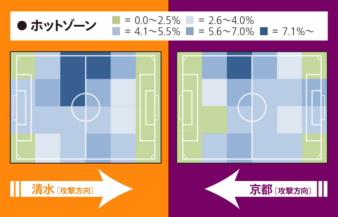 京都のレーダーチャートを見ると、攻撃の項目が平均以下、守備の項目が平均以上という傾向で、描く形は昨季と類似性があって、スタイルを継続していることがうかがえる。システムも昨季と同じ4-3-3(中盤が逆三角形)を継続している。唯一昨季と大きく異なるのは……