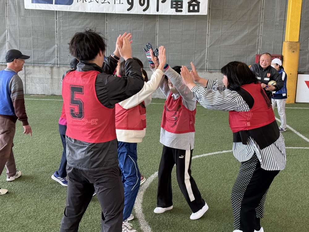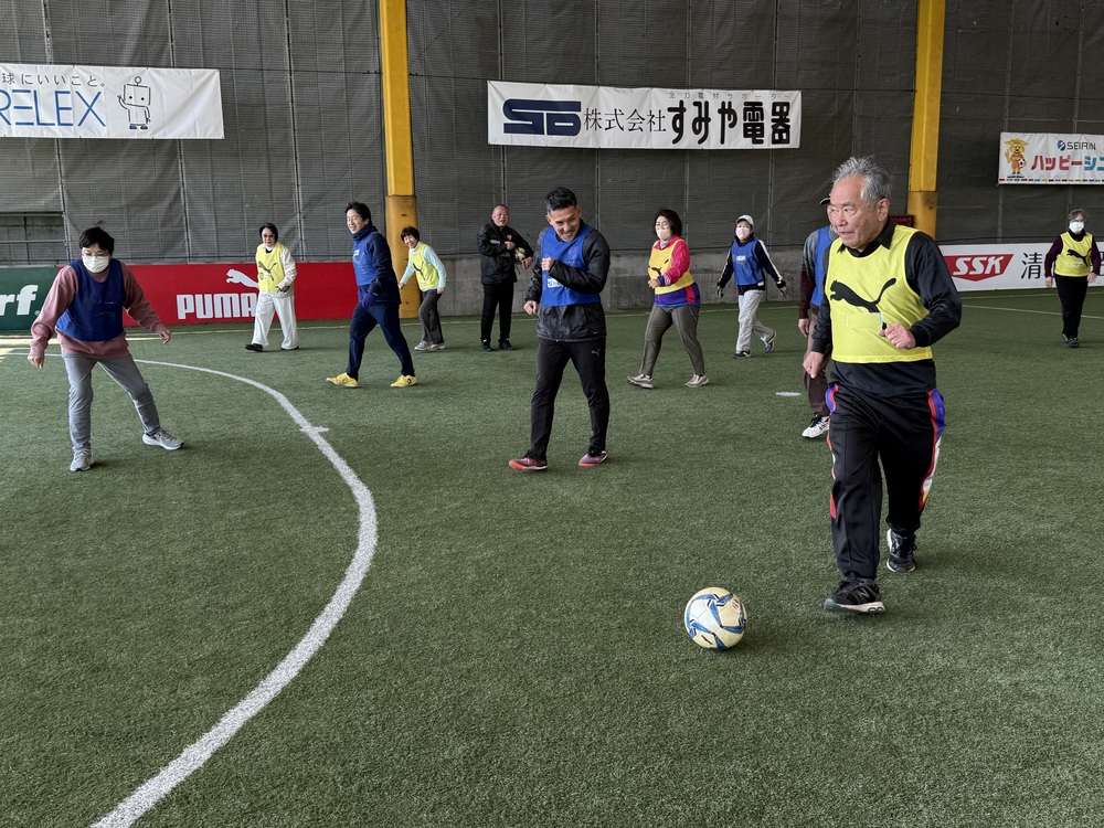 走るのも、ぶつかるのも禁止のウォーキングフットボールは、体力に自信がない方でも怪我無く安心です。今回初めてチャレンジした皆さんも、普段サッカーをプレーすることが全くない皆さんでも、楽しく安全にプレーすることができました。ゴールが決まった瞬間には、チームメイトと喜びを共有しあい、身体や脳の活性化だけでなく、コミュニティの場としても非常に楽しい時間を過ごしていただけます。