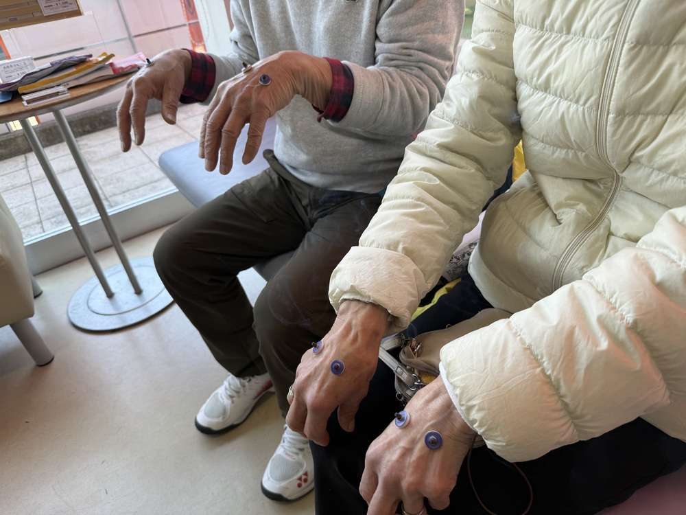 家庭用のセルフケア商品「こりスポッと」を使って、コリが気になる部位のツボに貼る「ツボ刺激体験」。丸いシールに小さな樹脂の粒が付いており、鍼のように刺さったりしないタイプなので、金属アレルギーの方や、鍼が苦手な方にも抵抗なく体験いただくことができます。また、新潟県産の上質なもぐさを使用したお灸「台座灸ヨモニコ」体験も可能です。参加者の皆さんは、それぞれコリが気になる部位に、運動の前や後に「ツボ刺激」体験をしていただき、セイリンの鍼灸商品の効果を実感いただけます。