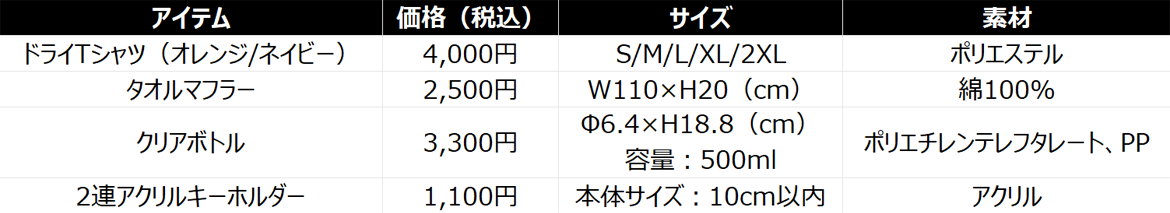 ユニフォーム(1st)/Tシャツ(2種)/フェイスタオル/アクリルスタンド/アクリルキーホルダー