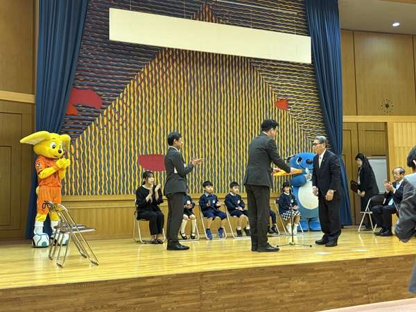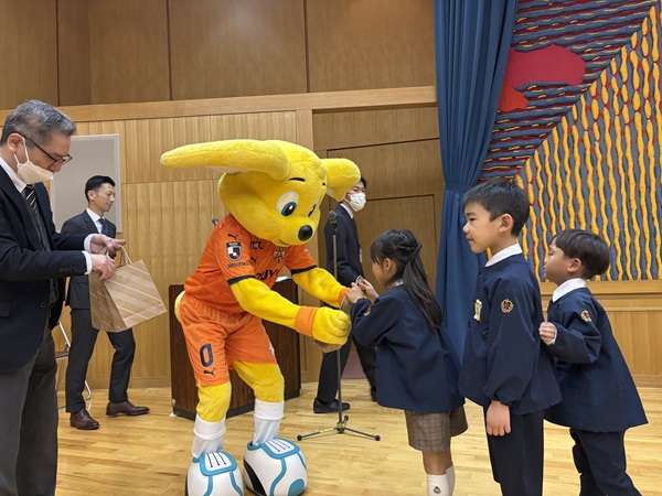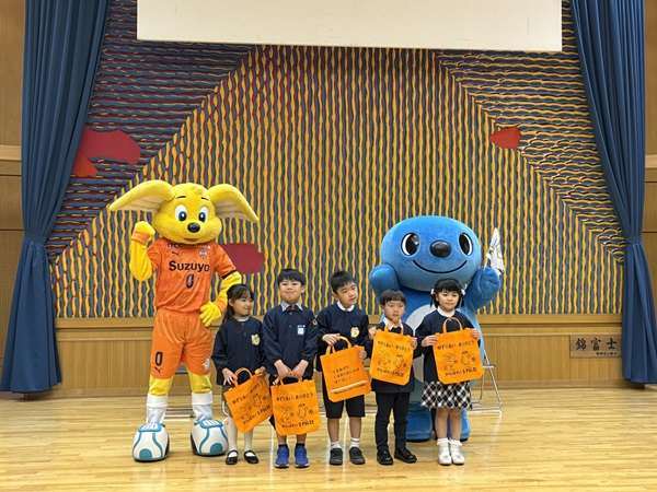 贈呈式では静岡市清水明るい社会づくり推進協議会 田宮理事長、役員の皆さんから清水区内の代表園児5名へ黄色いバッグが手渡されました。赤堀文宣静岡市教育長、塩原博清水区長も立会として出席され、赤堀教育長からは「多くの方の善意によって、このバッグを贈呈していただきました。新1年生の皆さんはぜひこのバッグを片手に学校に通って楽しい学校生活を送ってください。」と挨拶がありました。シズラと一緒に贈呈式に出席したパルちゃんは、園児の皆さんと一緒に記念撮影を行いました。