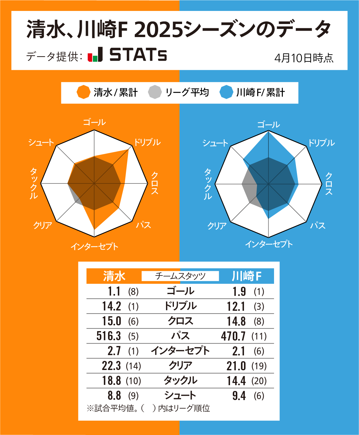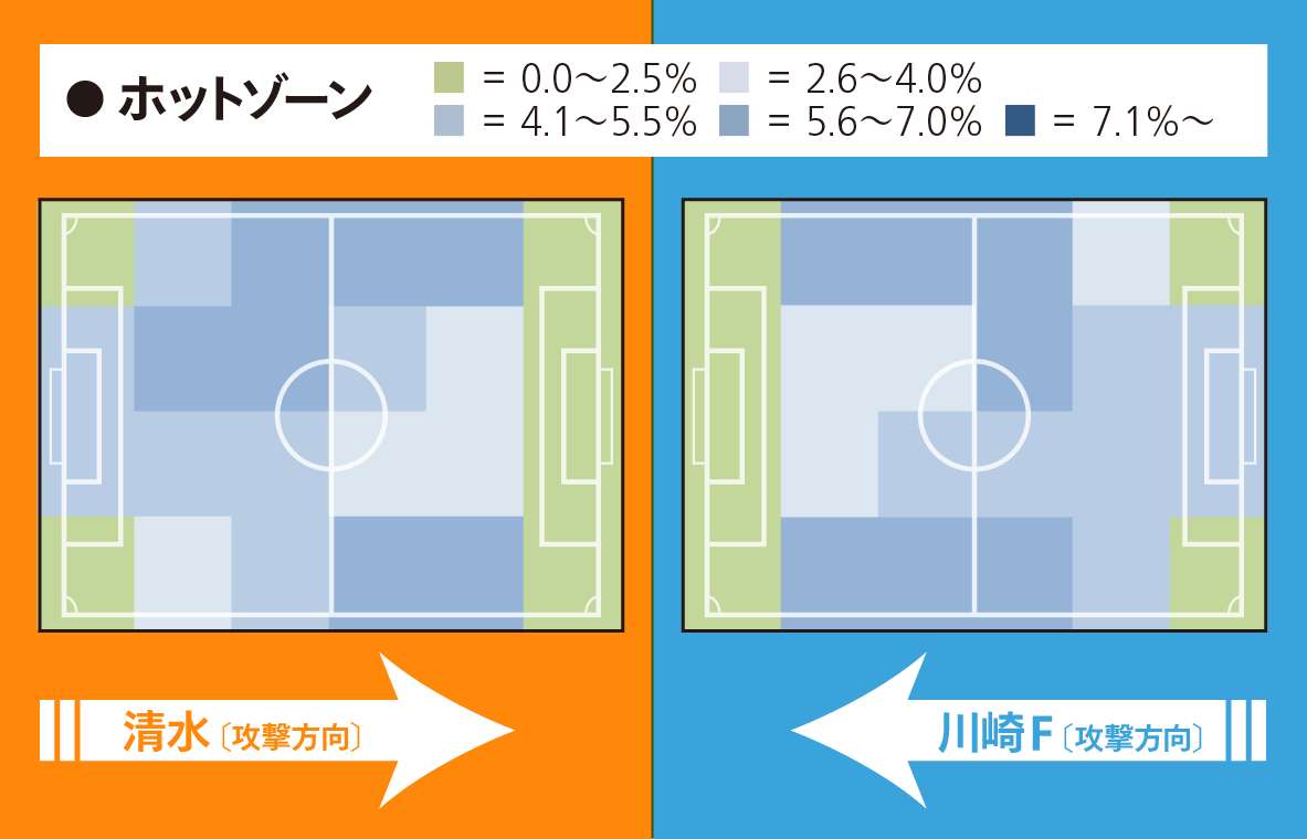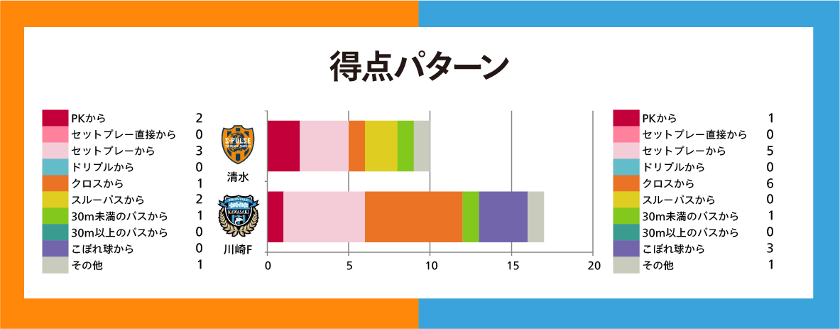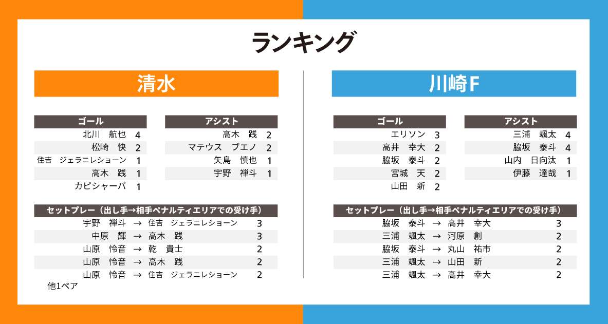 川崎Fのレーダーチャートを見ると、攻撃の全項目とインターセプトが平均を上回り、とくにシュート数に比べてゴール数が多いことが目立つ。シュート決定率は15.0%と高く、3得点のエリソンを筆頭に、2得点が4人、1得点が6人とどこからでも点が取れるのが強みと言える。ただ……