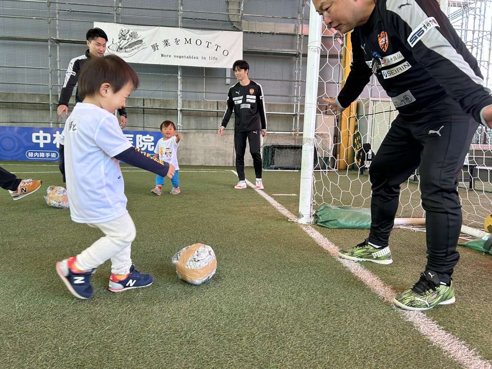 作ったボールを「なげる」・「とる」といった動作を必要とするキャッチボールや、ボールを「ける」・「わたす」動作が主となるシュート練習などを行います。最後はボールを使ったサッカー対決を親子で実施し、ゲーム形式の中で楽しく運動する機会を創出します。