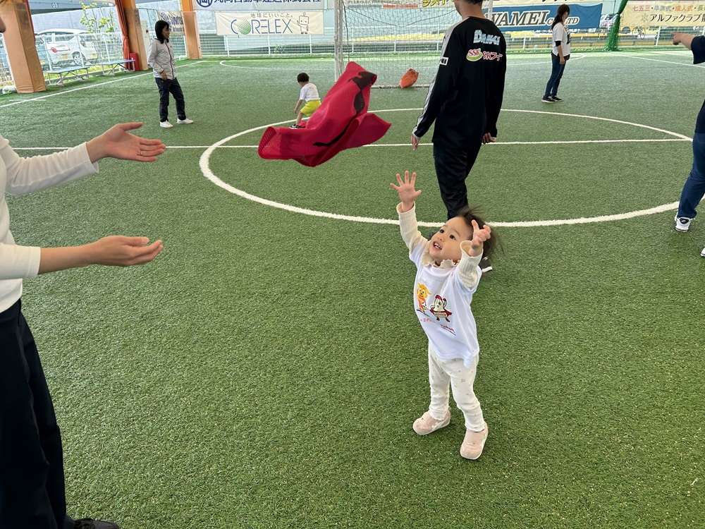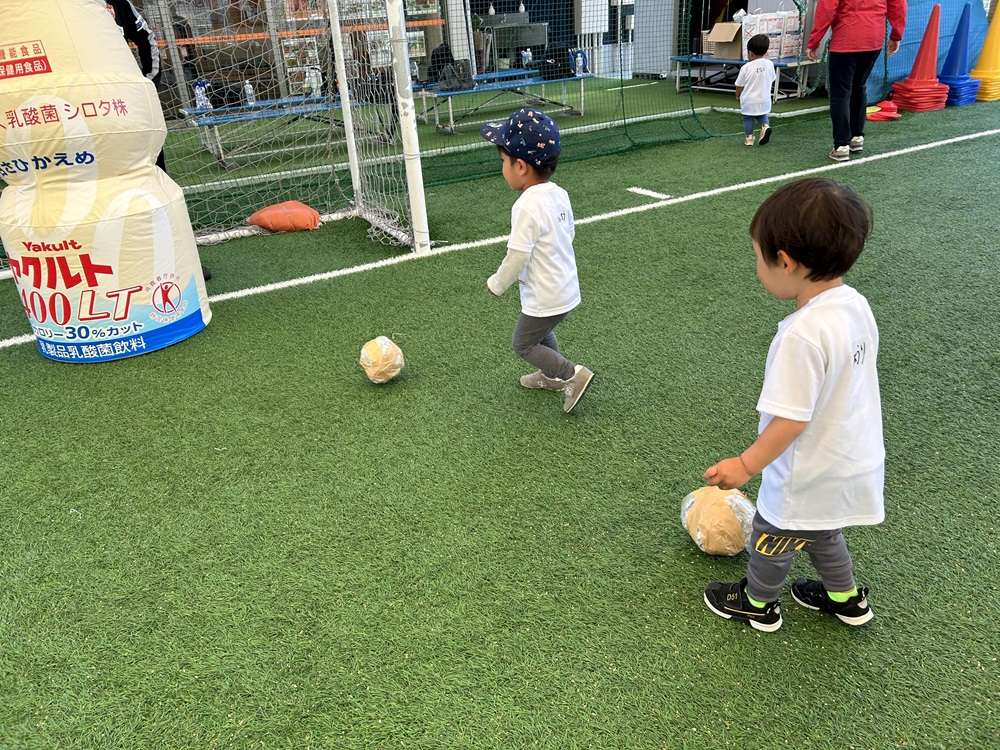 作ったボールを「なげる」・「とる」といった動作を必要とするキャッチボールや、ボールを「ける」・「わたす」動作が主となるシュート練習などを行います。最後はボールを使ったサッカー対決を親子で実施し、ゲーム形式の中で楽しく運動する機会を創出します。