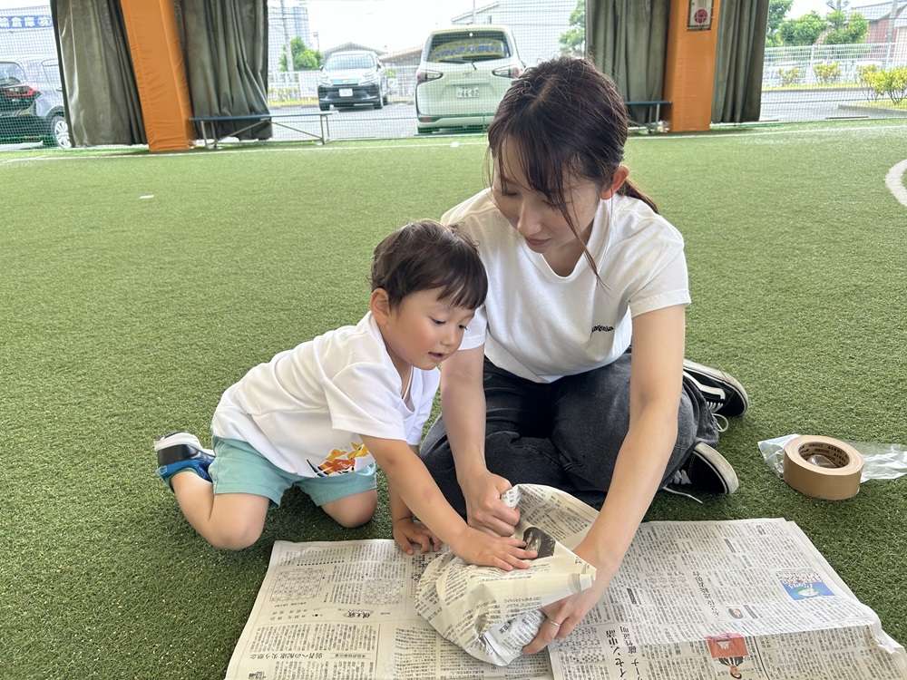 親子で新聞紙を丸めてサッカーボール作りにチャレンジします。手先を使ってモノを作る「工作」は子どもの成長には欠かせない重要な要素の1つとなります。工作を取り入れることで子供たちの好奇心に刺激を与え、集中力を高めます。