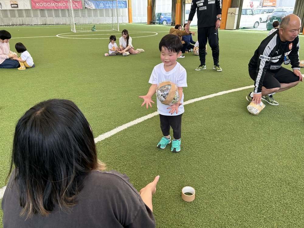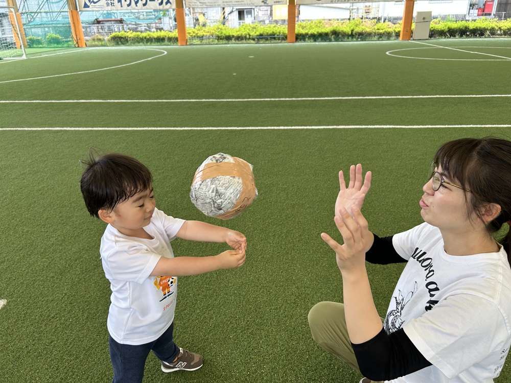 作ったボールを「なげる」・「とる」といった動作を必要とするキャッチボールや、ボールを「ける」・「わたす」動作が主となるシュート練習などを行います。最後はボールを使ったサッカー対決を親子で実施し、ゲーム形式の中で楽しく運動する機会を創出します。
