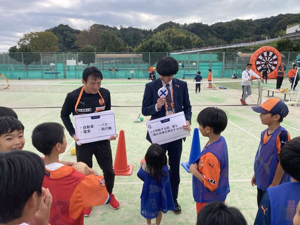 ホームゲーム時に開催している通常のスクールパークに加え、サッカーゲームとエコクイズを掛け合わせた企画を実施!大人から子どもまで、どなたでも楽しめるサッカーゲームでスクールコーチと環境について学びましょう。