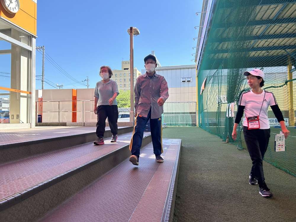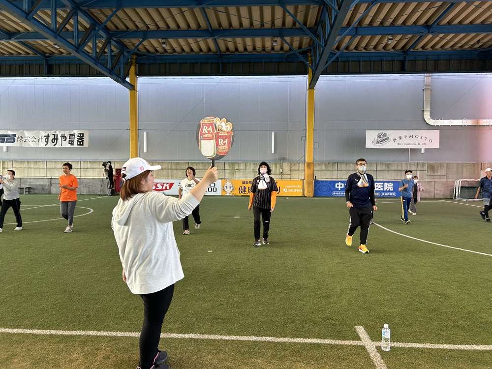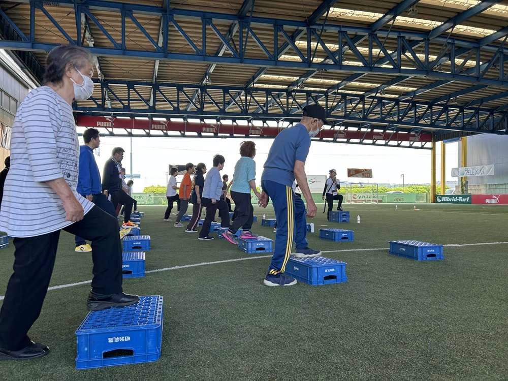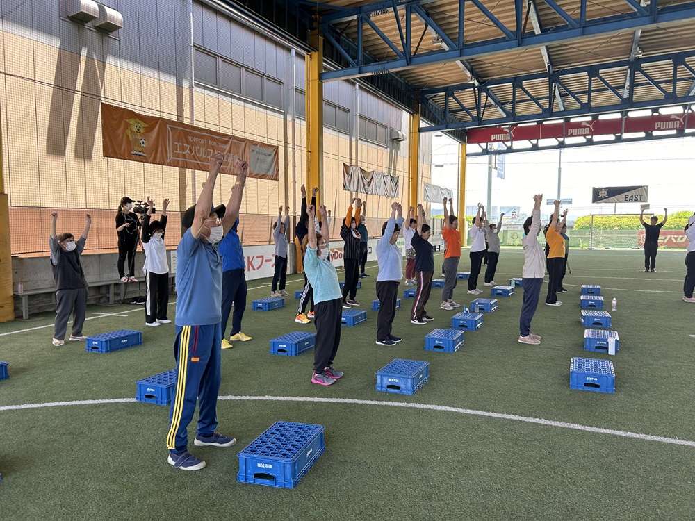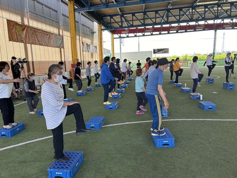 ソーシャルフィットネス協会指導員の指導のもと、中之条研究から導き出された健康長寿のための正しい歩き方と中強度運動の黄金律(モノサシ)を解説いただき、講義のあとはピッチにて正しい歩き方の実践、ラクラク筋トレ・ストレッチ・栄養に関する役立つ取組法もご紹介いただきました。