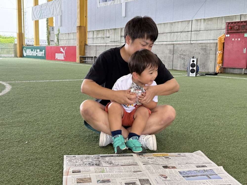 親子で新聞紙を丸めてサッカーボール作りにチャレンジします。手先を使ってモノを作る「工作」は子どもの成長には欠かせない重要な要素の1つとなります。工作を取り入れることで子供たちの好奇心に刺激を与え、集中力を高めます。