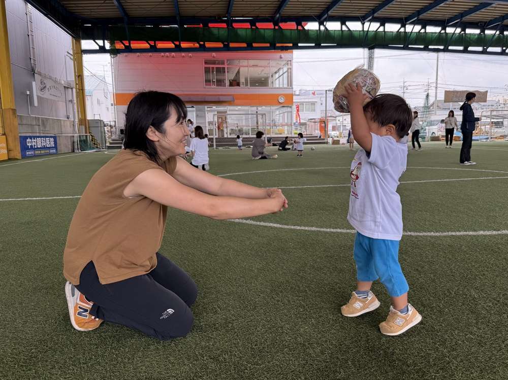 作ったボールを「なげる」・「とる」といった動作を必要とするキャッチボールや、ボールを「ける」・「わたす」動作が主となるシュート練習などを行います。最後はボールを使ったサッカー対決を親子で実施し、ゲーム形式の中で楽しく運動する機会を創出します。