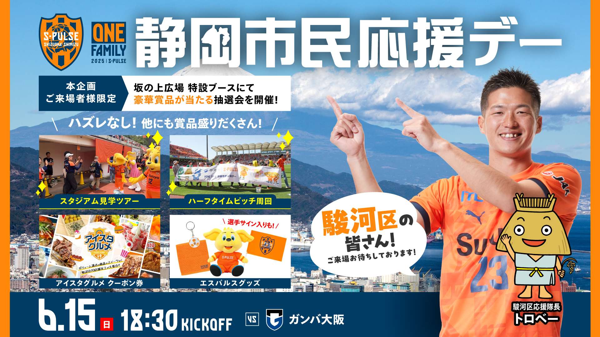 エスパルスは静岡市との交流事業として、ホームタウン静岡市にお住いの皆さんを対象に、ホームゲームへのご優待企画を実施します。6月15日(日)ガンバ大阪戦は《駿河区》の日として、静岡市駿河区の魅力を発信するブース出展、駿河区応援隊長「トロベー」来場、秋山 知駿河区長によるピッチグリーティング及び試合前の花束贈呈を実施しますのでお知らせいたします。