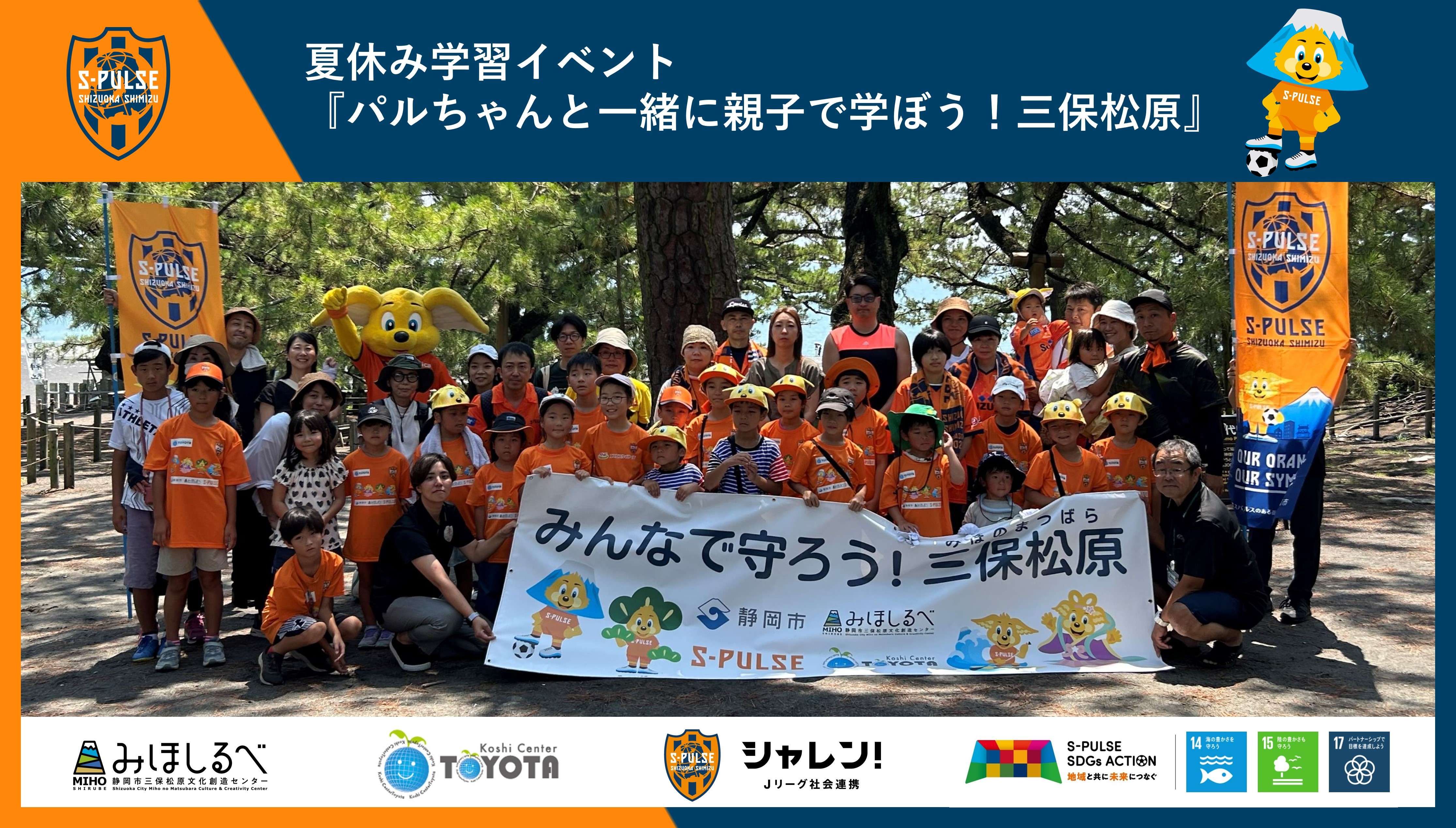 エスパルスは静岡市と連携し、三保松原の保全啓発活動を実施しています。この度、(株)故紙センタートヨタ様にご協力いただき、小学生親子を対象とした三保松原学習イベント『パルちゃんと一緒に親子で学ぼう!三保松原』を開催いたしますので、お知らせします。