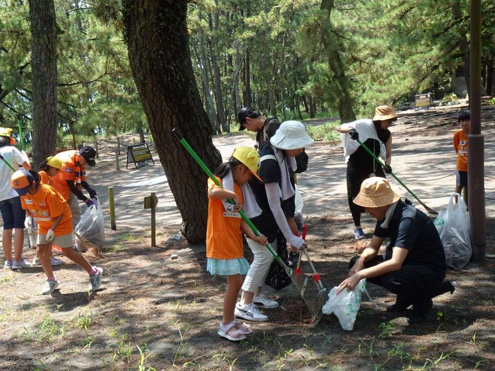 後半は、美しい松原の風景と防災林としての松原を守るための松葉かきボランティアを体験いただきます。海風に吹かれ、松籟(しょうらい)と蝉の声を聞きながら、三保松原の未来のために汗を流してみませんか。お気に入りのキノコや昆虫が見つかるかも?!イベントにはパルちゃんも参加!夏休みの自由研究にもおススメです。親子で楽しく世界遺産三保松原について学びましょう!