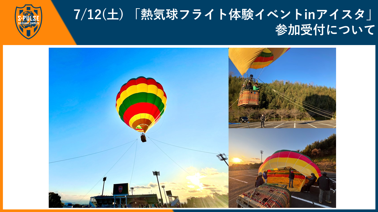 清水エスパルスのホームスタジアム「IAIスタジアム日本平(アイスタ)」で「熱気球フライト体験イベントinアイスタ」を7月12日(土)に実施します。清水港そして三保を見渡すことができ、雲の状況によっては富士山も見えるという、アイスタの魅力である景観の良さと、熱気球フライトというなかなか経験していただくことのできない体験がマッチした特別な企画にぜひご参加ください。
