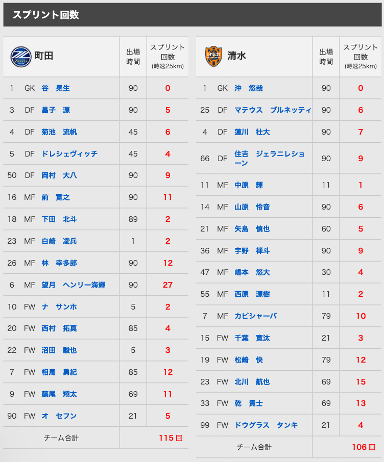 2025年7月5日(土)に行なわれた、明治安田J1リーグ 第23節 vs 町田 @Gスタ のトラッキングデータは下記の通りです。