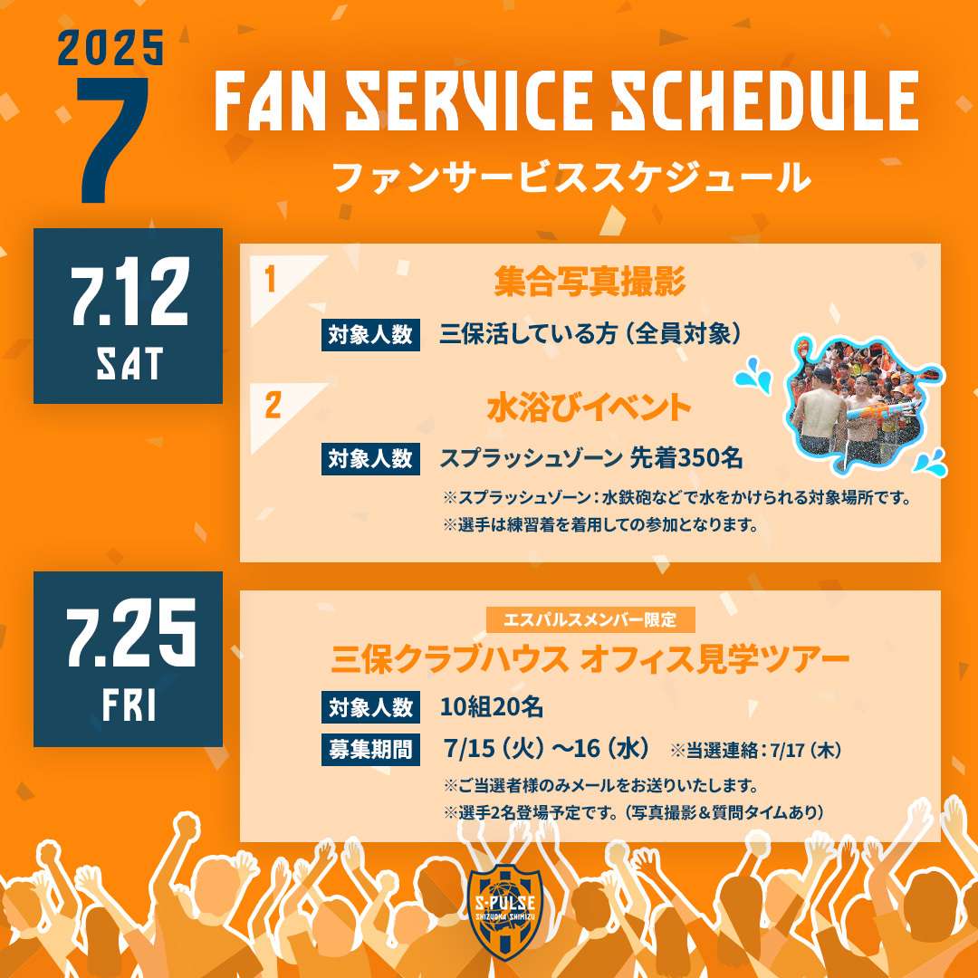 S-PULSE MEMBER様(レギュラー、ライト、ジュニア、法人会員)の中から、抽選で10組20名様(1グループ最大2名)に、練習後のファンサービスにご参加いただけます。