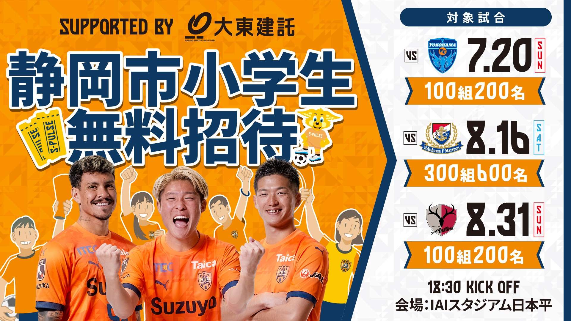 清水エスパルスは、クラブパートナーの大東建託様と静岡市内の小学校に通う児童の皆様を対象にホームゲーム3試合に招待企画を実施しますので、下記の通りお知らせします。Jリーグのチーム、選手を身近に感じ、プロスポーツへの夢や憧れを抱いてもらうことで、健全育成に貢献していくことも目的としております。