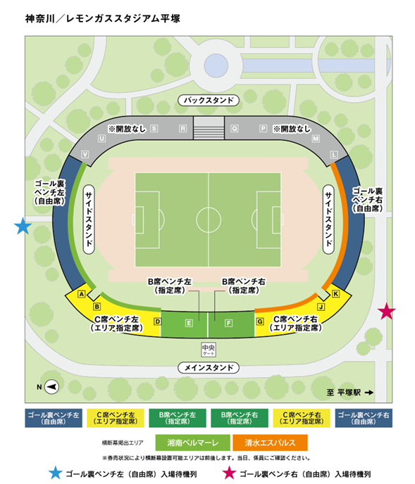 ・立見応援、鳴り物を使用しての応援は、ゴール裏ベンチ右・左(自由席)のみ可能です。
